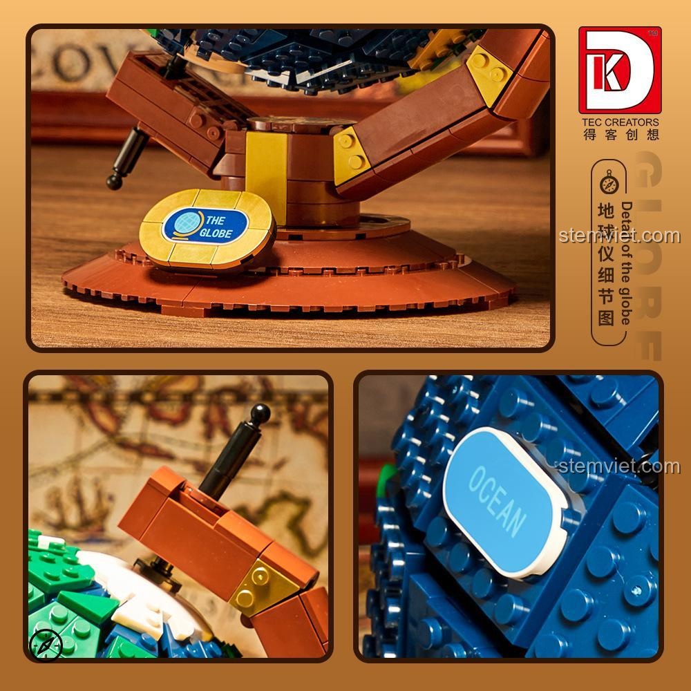 Mô hình Quả Địa Cầu TEC Creators 80006 là sự kết hợp hoàn hảo giữa vẻ đẹp cổ điển và sự thú vị của đồ chơi lắp ráp. Với chiều cao ấn tượng 30.2 cm, quả địa cầu nổi bật trên giá đỡ màu nâu gỗ sang trọng, gợi nhớ đến những quả địa cầu trong thư viện của các nhà thám hiểm vĩ đại. Các mảng màu được phối hợp hài hòa: màu xanh dương của đại dương bao la, màu xanh lá và vàng cát của các lục địa. Từng chi tiết nhỏ như bảng tên ‘The Globe’, la bàn trang trí và các nhãn tên tiếng Anh cho các châu lục, đại dương đều được tái hiện tỉ mỉ, tạo nên một tác phẩm nghệ thuật thực sự. Đây chắc chắn sẽ là một điểm nhấn đầy tri thức và tinh tế cho bất kỳ không gian nào, từ bàn học của con đến phòng khách của gia đình.