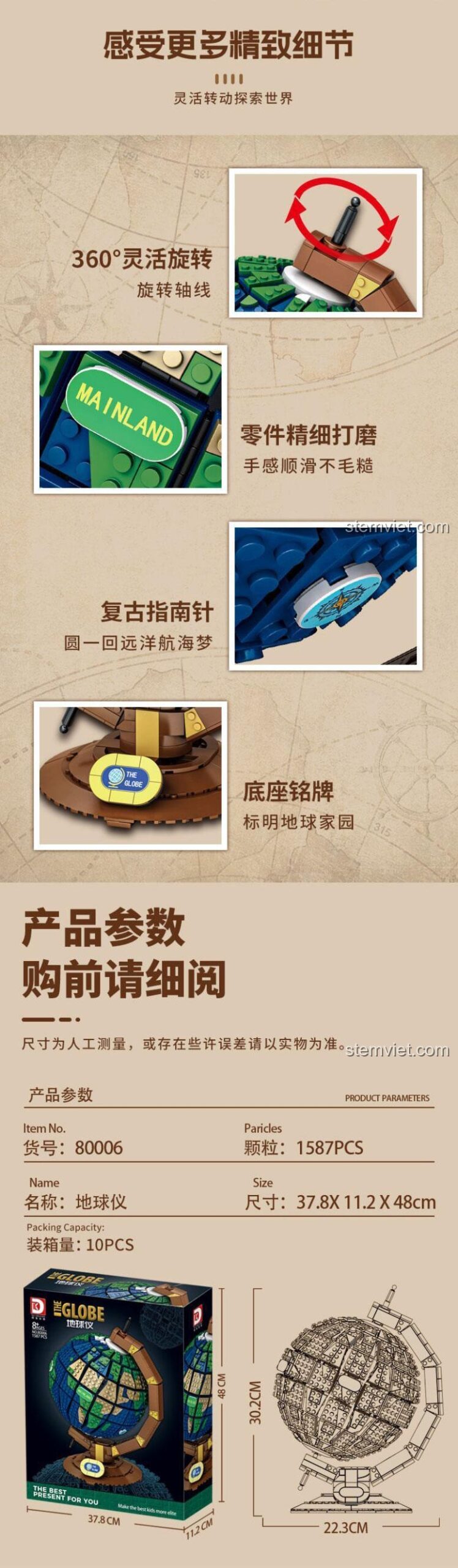 Sau khi lắp ráp xong, TEC Creators 80006 Mô hình Địa Cầu xoay có kích thước khá ấn tượng: chiều dài 22.3 cm, chiều rộng 22.3 cm và chiều cao 30.2 cm. Kích thước này rất lý tưởng để trưng bày trên bàn học hoặc kệ sách.