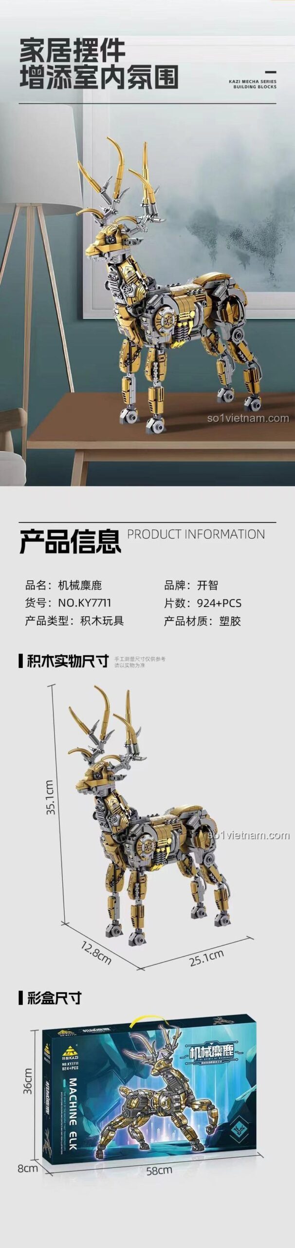 Ngay từ cái nhìn đầu tiên, đồ chơi mô hình Robot Tuần Lộc KY7711 đã gây ấn tượng mạnh mẽ bởi vẻ ngoài độc đáo và chi tiết. Với kích thước ấn tượng 25.1 x 12.8 x 35.1 cm sau khi hoàn thành, đây chắc chắn sẽ là tâm điểm của mọi không gian trưng bày. Tông màu chủ đạo Vàng gold kết hợp với Xám kim loại và Đen tạo nên một tổng thể vừa sang trọng, vừa bí ẩn, đậm chất công nghệ cao. Các nhà thiết kế đã khéo léo lồng ghép những chi tiết máy móc phức tạp như piston, dây cáp, bánh răng vào hình dáng tự nhiên của một con tuần lộc, tạo nên một sự tương phản thú vị. Đặc biệt, cặp sừng cơ khí được tạo hình tinh xảo, vừa thể hiện sự uy nghi của chúa sơn lâm, vừa mang hơi thở của tương lai. Từng mảnh ghép đều được chăm chút tỉ mỉ, mang đến một mô hình với độ chi tiết cao, chân thực đến không ngờ.