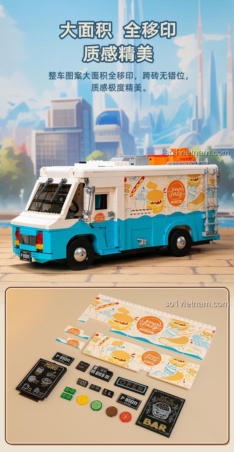 Ngay từ cái nhìn đầu tiên, đồ chơi mô hình Pantasy 85011 đã chinh phục mọi ánh nhìn bằng vẻ ngoài không thể trộn lẫn. Sự kết hợp giữa hai tông màu chủ đạo là xanh lơ và trắng kem tạo nên một tổng thể hài hòa, tươi mát và đậm chất vintage. Với kích thước ấn tượng dài 40cm, rộng 15.4cm và cao 18.8cm, mô hình này đủ lớn để trở thành tâm điểm trong bất kỳ bộ sưu tập nào. Điều làm nên sự khác biệt của Pantasy chính là công nghệ in pad cao cấp. Toàn bộ các họa tiết, từ logo ‘Keep Tasty’, menu đồ ăn, cho đến các hình trang trí vui nhộn bên hông xe, đều được in trực tiếp lên từng viên gạch. Bạn sẽ không phải loay hoay với những miếng sticker dễ bong tróc hay lệch lạc. Từng đường nét sắc sảo, màu sắc bền đẹp, mang lại một cảm giác cao cấp và chân thực đến không ngờ. Thiết kế thông minh cho phép bạn khám phá trọn vẹn ‘cơ ngơi’ bên trong: cửa xe, cửa sổ phục vụ, mái che và cả cửa thông gió trên nóc đều có thể mở ra, tạo nên một không gian sống động và đầy tính tương tác.