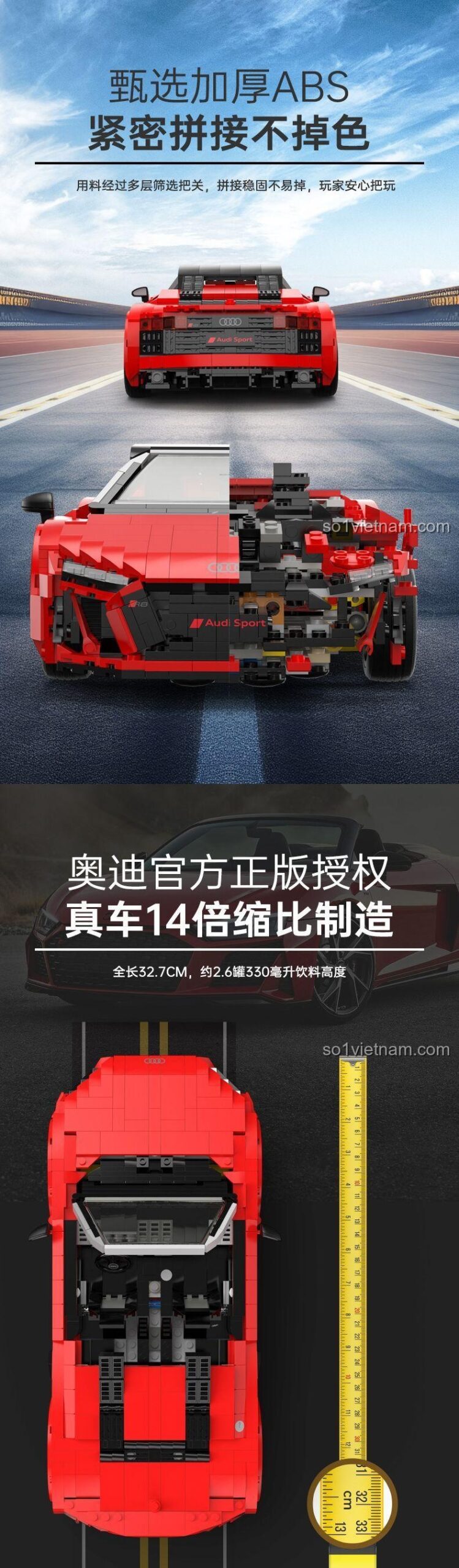 Khi chọn đồ chơi cho con, an toàn và chất lượng luôn là ưu tiên hàng đầu của mẹ. Với Xe đua Audi R8 Spyder 93800, mẹ có thể hoàn toàn yên tâm. Toàn bộ 1440 chi tiết đều được làm từ nhựa ABS nguyên sinh cao cấp, một loại vật liệu bền bỉ, không độc hại và đạt các tiêu chuẩn an toàn quốc tế. Các mảnh ghép được gia công chính xác, có độ khít cao, giúp mô hình sau khi lắp ráp trở nên cực kỳ vững chắc, không dễ dàng bị rơi rớt các chi tiết dù bé có cầm chơi và di chuyển. Điều đặc biệt hơn, mẹ sẽ phải bất ngờ khi biết rằng chất lượng của bộ đồ chơi này hoàn toàn tương đương với các sản phẩm của LEGO®, nhưng lại có mức giá hợp túi tiền hơn rất nhiều. Đây chính là một lựa chọn siêu tiết kiệm, giúp mẹ đỡ đau ví mà vẫn đảm bảo cho con trai một món đồ chơi xịn sò, chất lượng và an toàn tuyệt đối.