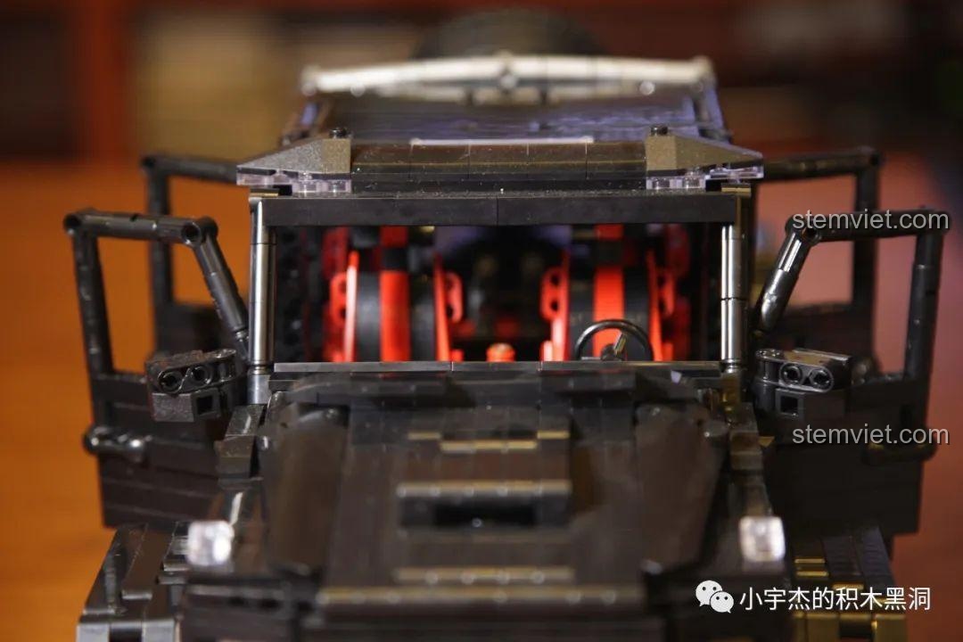 Khoác lên mình bộ áo đen tuyền mạnh mẽ, mô hình Rael LE-J901D toát lên một vẻ đẹp đầy uy lực, giống hệt nguyên mẫu. Với tỉ lệ vàng 1:8, chiếc xe sau khi hoàn thành có kích thước khổng lồ dài đến 48cm, đủ sức làm lu mờ mọi mô hình khác. Từng chi tiết thiết kế đều được chăm chút tỉ mỉ: từ lưới tản nhiệt đặc trưng với logo ngôi sao ba cánh, cụm đèn pha trong suốt, cho đến bộ lốp địa hình siêu lớn và hệ thống ống xả kép bên hông. Mở cửa xe ra, bố và bé sẽ khám phá một không gian nội thất chi tiết với ghế ngồi thể thao màu đỏ nổi bật, vô lăng, và bảng điều khiển. Đặc biệt, khi mở nắp capo, khối động cơ V8 mô phỏng với các piston chuyển động sẽ hiện ra, một minh chứng cho sự tinh xảo trong thiết kế của bộ đồ chơi mô hình Rael LE-J901D.