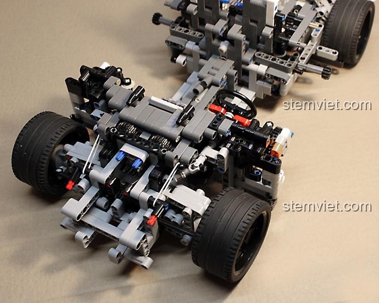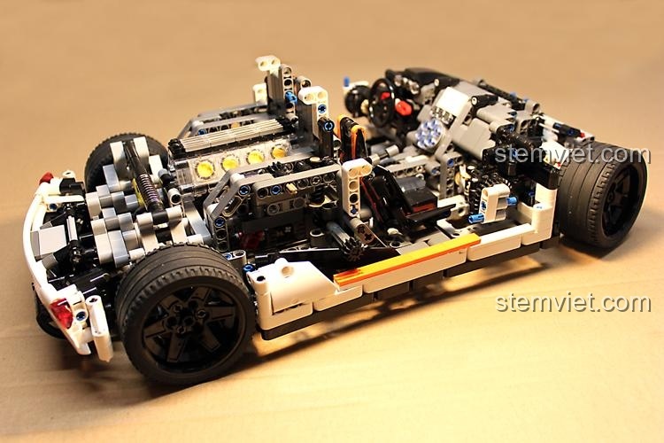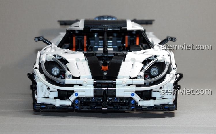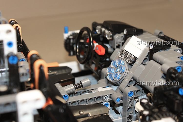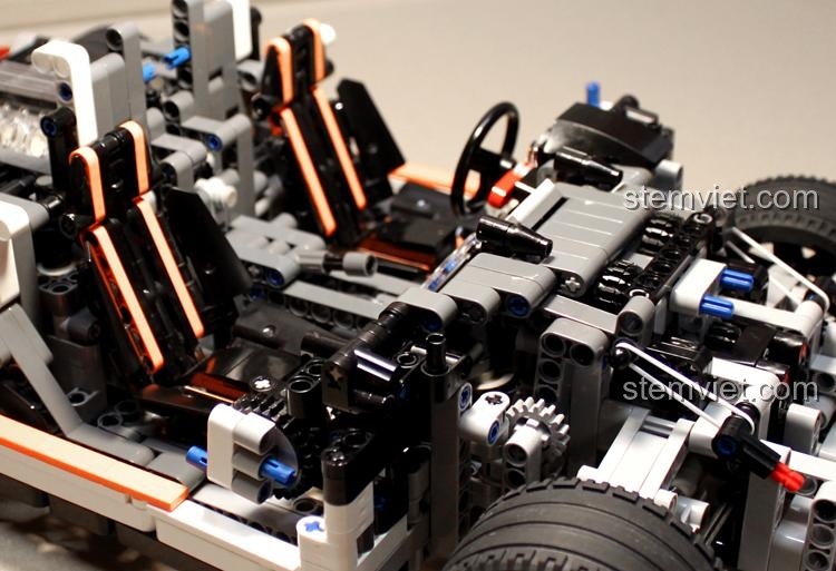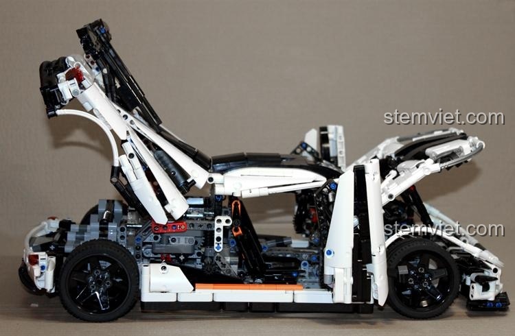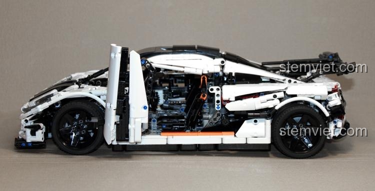 Điều làm nên linh hồn của một mô hình Technic chính là các tính năng cơ khí, và đồ chơi xây dựng MOC-4789 Koenigsegg One:1 sẽ không làm bạn thất vọng. Đây là một bản giao hưởng của các bánh răng, trục và đòn bẩy. Bên dưới lớp vỏ hào nhoáng là một cỗ máy phức tạp đang chờ bạn khám phá. Hệ thống lái hoạt động trơn tru, được kết nối với cả vô lăng trong cabin và một núm xoay ‘Hand of God’ (HOG) được giấu kín đáo để dễ dàng điều khiển. Cả bốn bánh xe đều được trang bị hệ thống treo độc lập, giúp xe vận hành êm ái trên mọi địa hình tưởng tượng. Khi xe di chuyển, bạn có thể quan sát các piston của động cơ V8 mô phỏng chuyển động lên xuống nhịp nhàng. Nhưng ngôi sao của buổi trình diễn chính là hộp số tuần tự 7 cấp cộng với số lùi. Bạn có thể chuyển số bằng một lẫy chuyển số trong cabin, cảm nhận từng bước chuyển số đầy thỏa mãn. Tất cả những tính năng này, từ cánh gió sau có thể điều chỉnh đến nắp capo và khoang động cơ có thể mở, biến mô hình này thành một công cụ khám phá kỹ thuật vô cùng trực quan và hấp dẫn.