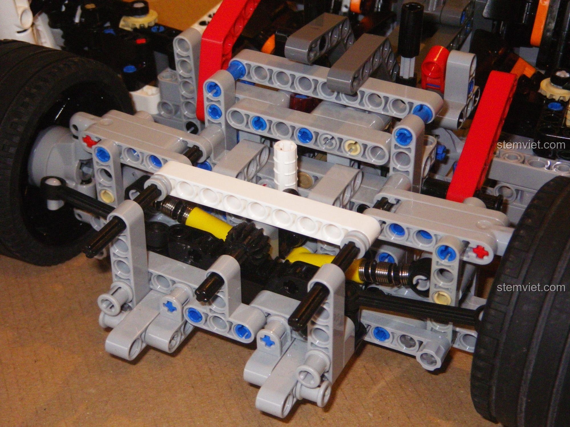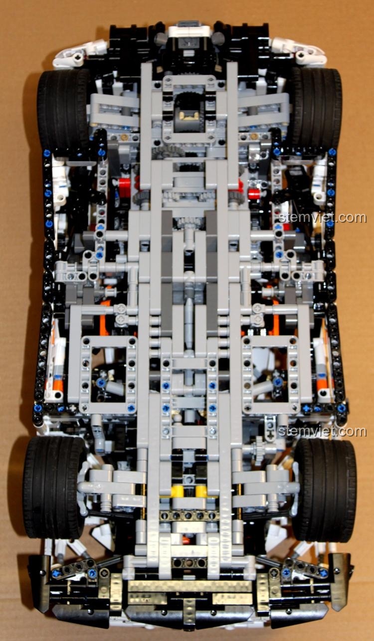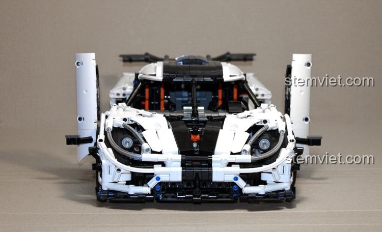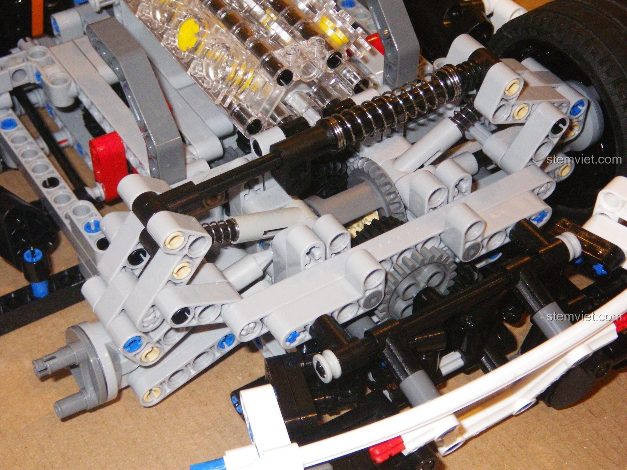 Điều làm nên linh hồn của một mô hình Technic chính là các tính năng cơ khí, và đồ chơi xây dựng MOC-4789 Koenigsegg One:1 sẽ không làm bạn thất vọng. Đây là một bản giao hưởng của các bánh răng, trục và đòn bẩy. Bên dưới lớp vỏ hào nhoáng là một cỗ máy phức tạp đang chờ bạn khám phá. Hệ thống lái hoạt động trơn tru, được kết nối với cả vô lăng trong cabin và một núm xoay ‘Hand of God’ (HOG) được giấu kín đáo để dễ dàng điều khiển. Cả bốn bánh xe đều được trang bị hệ thống treo độc lập, giúp xe vận hành êm ái trên mọi địa hình tưởng tượng. Khi xe di chuyển, bạn có thể quan sát các piston của động cơ V8 mô phỏng chuyển động lên xuống nhịp nhàng. Nhưng ngôi sao của buổi trình diễn chính là hộp số tuần tự 7 cấp cộng với số lùi. Bạn có thể chuyển số bằng một lẫy chuyển số trong cabin, cảm nhận từng bước chuyển số đầy thỏa mãn. Tất cả những tính năng này, từ cánh gió sau có thể điều chỉnh đến nắp capo và khoang động cơ có thể mở, biến mô hình này thành một công cụ khám phá kỹ thuật vô cùng trực quan và hấp dẫn.
