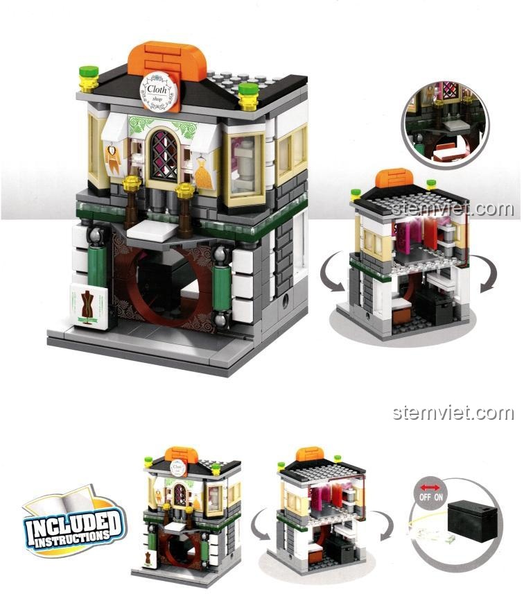 Ngay từ cái nhìn đầu tiên, Mô hình Cửa hàng Vải 6540 đã chinh phục mọi ánh nhìn bởi thiết kế kiến trúc cổ điển đầy duyên dáng. Tòa nhà hai tầng với tông màu xám, xanh rêu và trắng chủ đạo, điểm xuyết những chi tiết màu cam ấm áp, tạo nên một tổng thể hài hòa và bắt mắt. Tầng một gây ấn tượng với cửa chính hình vòm lớn độc đáo, hai bên là các ma-nơ-canh trưng bày trang phục, gợi lên không khí của một tiệm may đo thực thụ. Tầng hai là không gian làm việc với cửa sổ lớn và ban công nhỏ xinh. Điểm đặc biệt nhất của bộ lắp ráp Tiệm Vải Mini SEMBO là thiết kế ‘mở’, cho phép bé dễ dàng lật mặt sau của mô hình ra để khám phá và bài trí không gian nội thất bên trong. Và khi màn đêm buông xuống, chỉ cần một nút bấm, viên gạch phát sáng sẽ thắp lên ánh đèn vàng ấm áp, biến cửa hàng trở nên lung linh, huyền ảo, mang lại một trải nghiệm chơi đầy mê hoặc cho bé.