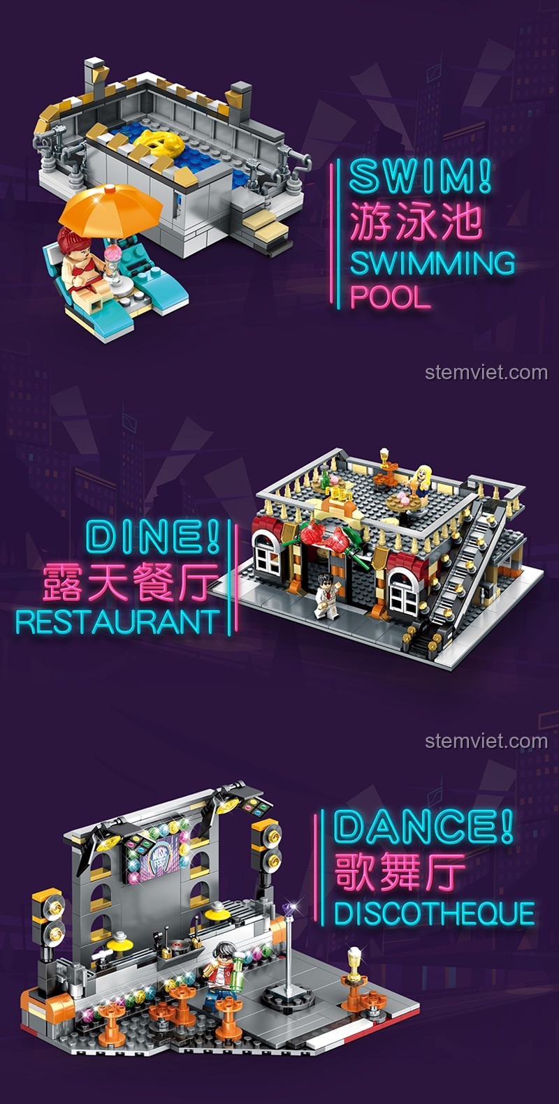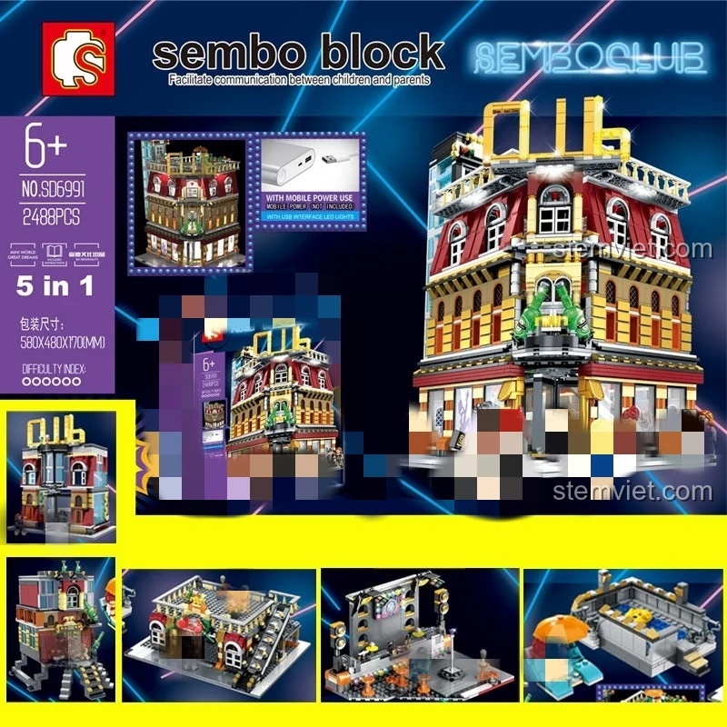 “5 trong 1” có nghĩa là từ một bộ sản phẩm bộ xếp hình SD6991, bạn có thể lắp ráp thành một tòa nhà lớn hoàn chỉnh, hoặc tách ra thành 5 khu vực, module riêng biệt để chơi hoặc trưng bày, bao gồm: tòa nhà chính, bể bơi, phòng karaoke, nhà hàng và sàn nhảy.
