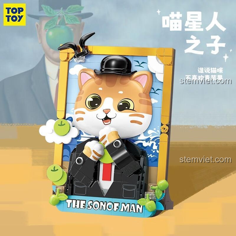 Bộ đồ chơi mô hình Con Trai Của Người TOP TOY TC1513 gây ấn tượng mạnh mẽ với thiết kế tỉ mỉ và màu sắc chủ đạo hài hòa, bao gồm Cam, Trắng, Xanh dương, Đen và Xanh lá. Mô hình mèo nghệ thuật này tái hiện chân thực hình ảnh chú mèo đội mũ phớt đen, mặc bộ vest lịch lãm, với quả táo xanh đặc trưng che khuất một phần khuôn mặt. Từng chi tiết nhỏ như đôi mắt to tròn, nụ cười tinh nghịch, hay chiếc cà vạt đỏ đều được chăm chút kỹ lưỡng, mang đến vẻ ngoài sống động và cuốn hút.