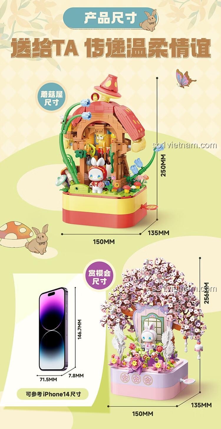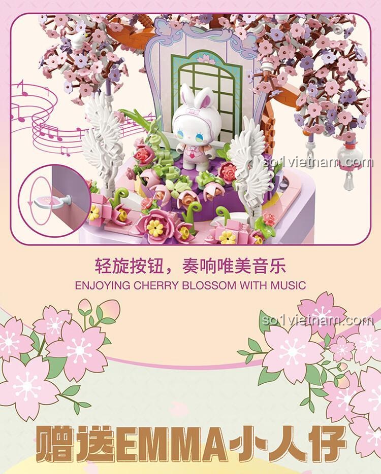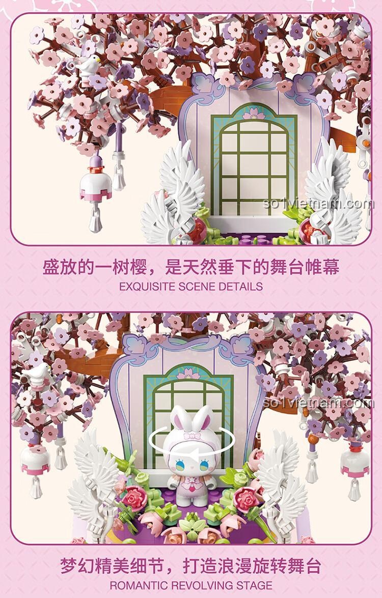 Ngay từ cái nhìn đầu tiên, đồ chơi mô hình Cây hoa anh đào lắp ráp này đã chinh phục mọi trái tim bởi vẻ đẹp tinh khôi và mộng mơ. Tác phẩm hoàn thiện cao tới 25.6 cm, nổi bật với một cây hoa anh đào khổng lồ được tạo nên từ hàng trăm chi tiết màu hồng, trắng và tím, nở rộ rực rỡ như một bức tranh thủy mặc. Dưới tán cây là một sân khấu nhỏ xinh, nơi nhân vật chính – cô bé thỏ EMMA trong bộ váy lễ hội – đang xoay tròn duyên dáng. Từng chi tiết nhỏ như những chiếc đèn lồng treo trên cây, những đóa hoa dưới chân sân khấu đều được chăm chút tỉ mỉ, tạo nên một tổng thể hài hòa, lãng mạn và đầy chất thơ. Đây chắc chắn sẽ là một vật trang trí tuyệt đẹp cho góc học tập hay phòng ngủ của bé gái.