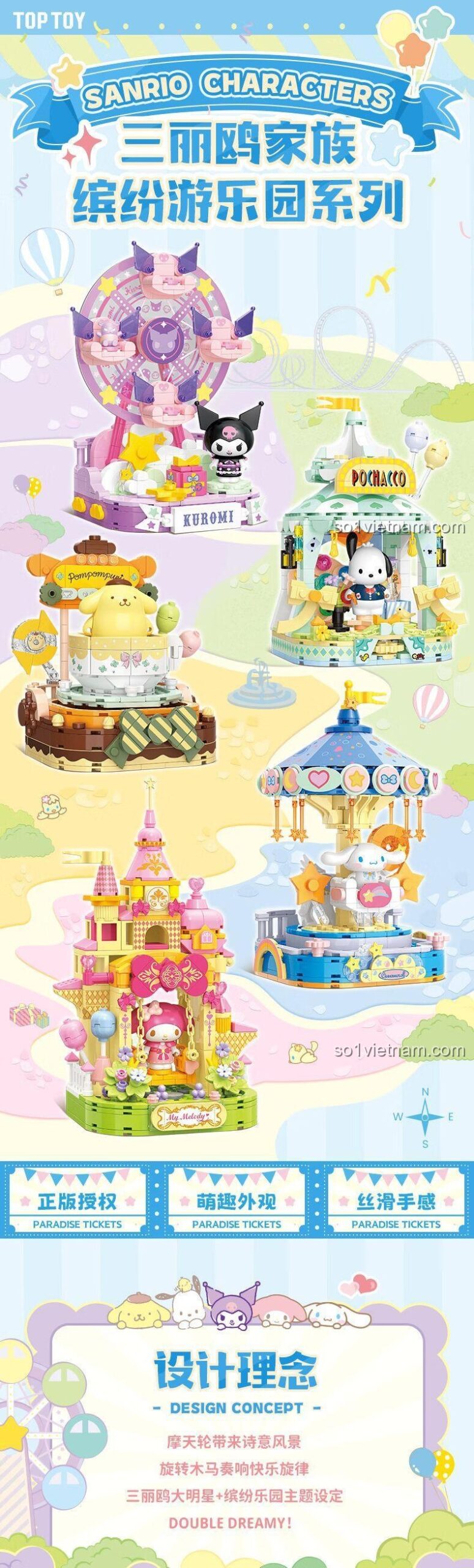 Bộ lắp ghép TOP TOY TC2023 nổi bật với thiết kế mô phỏng một vòng quay ngựa gỗ trong công viên giải trí, với tâm điểm là hình ảnh chú chó Pompompurin dễ thương. Các chi tiết được chăm chút tỉ mỉ, từ màu sắc tươi sáng đến hình dáng ngộ nghĩnh, tất cả tạo nên một tổng thể hài hòa và thu hút.