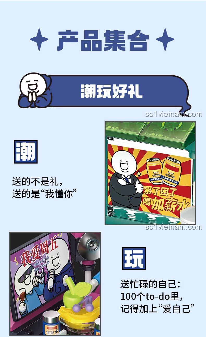 Bộ lắp ghép TOPTOY 16005 “Tiểu Lam Xã Hội: Chăn Quá Yêu Tôi” lấy cảm hứng từ nhân vật Tiểu Lam, một chàng trai trẻ với cuộc sống thường ngày đầy những tình huống dở khóc dở cười tại văn phòng. Nhân vật Tiểu Lam, với chiều cao 1.65m, tính cách hoạt bát, vui vẻ nhưng đôi khi cũng hơi hậu đậu, luôn mang đến những tiếng cười sảng khoái. Bộ mô hình tái hiện lại không gian làm việc quen thuộc, nơi Tiểu Lam đối mặt với deadline, những cuộc họp căng thẳng, hay đơn giản là những khoảnh khắc thư giãn bên tách cà phê. Câu chuyện về Tiểu Lam không chỉ phản ánh một phần cuộc sống hiện đại mà còn ẩn chứa những bài học ý nghĩa về sự kiên trì, đối mặt với thử thách và tìm thấy niềm vui trong công việc. Bộ lắp ghép này sẽ đưa bé vào một thế giới tưởng tượng, nơi bé có thể tự mình xây dựng và kể lại những câu chuyện của riêng mình, đồng thể hiện sự đồng cảm và thấu hiểu với những áp lực, niềm vui trong công việc của người lớn.