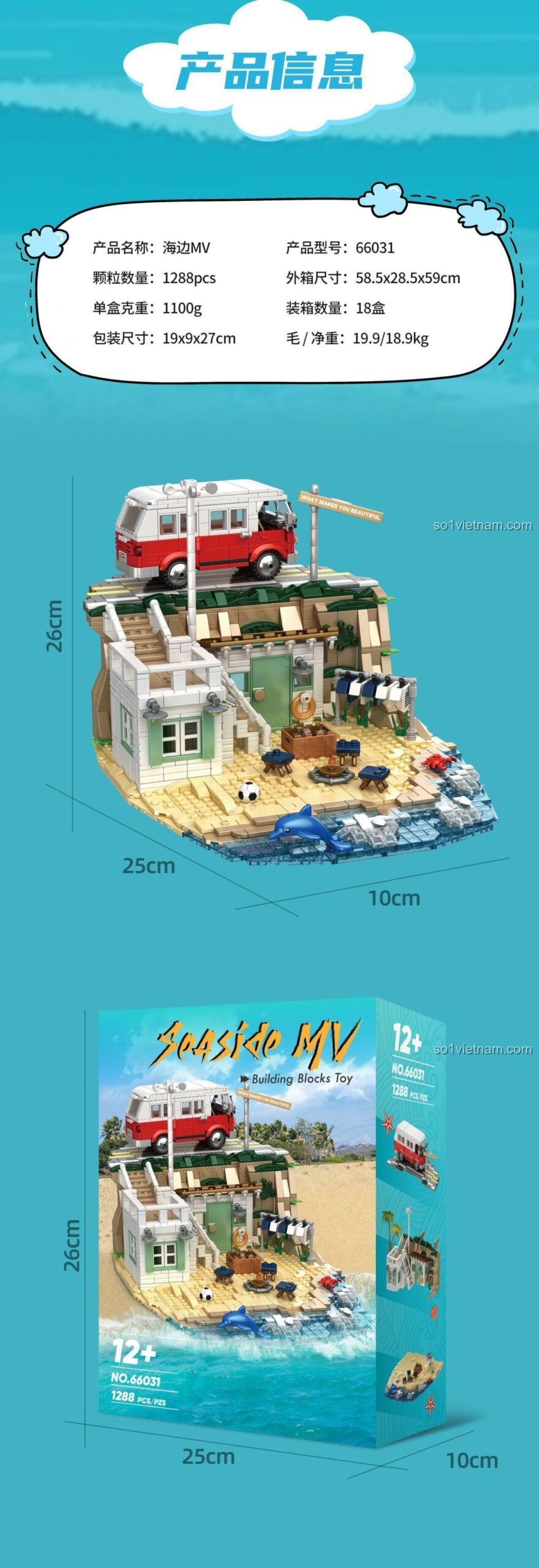 Với 1288 mảnh ghép, một thế giới ven biển thu nhỏ đầy sống động sẽ dần hiện ra dưới bàn tay bạn. Mô hình có kích thước ấn tượng 25 x 10 x 26 cm, được thiết kế theo cấu trúc hai tầng độc đáo. Tầng dưới là một bãi biển cát vàng được tạo nên từ những khối màu kem ấm áp, với những con sóng xanh trong vỗ về từ các chi tiết nhựa trong suốt. Một ngôi nhà nhỏ màu trắng với mái xanh và cửa sổ có thể đóng mở, một khu vực đốt lửa trại với ghế ngồi, một quả bóng, và cả một chú cá heo đang nô đùa… tất cả tạo nên một không gian nghỉ dưỡng yên bình. Điểm nhấn đặc biệt nằm ở tầng trên, nơi chiếc xe bus cắm trại màu đỏ trắng kinh điển đậu trên một con dốc, sẵn sàng cho những chuyến phiêu lưu mới. Mọi chi tiết, từ tấm biển ‘What Makes You Beautiful’ cho đến cây đàn guitar của anh chàng nhạc công, đều được chăm chút tỉ mỉ, mang đến một vẻ đẹp hài hòa và đầy tính nghệ thuật, biến nó thành một vật trang trí tuyệt vời cho bất kỳ không gian nào.