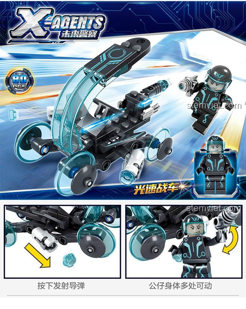 Ngay từ cái nhìn đầu tiên, Xe Chiến Đấu Quang Tốc đã gây ấn tượng mạnh mẽ bởi thiết kế đậm chất khoa học viễn tưởng. Từng đường nét, góc cạnh đều được trau chuốt tỉ mỉ, tạo nên một tổng thể vừa mạnh mẽ, vừa linh hoạt. Thân xe chủ đạo màu đen huyền bí, kết hợp hoàn hảo với các chi tiết trong suốt màu xanh lơ, gợi cảm giác như một dòng năng lượng đang cuộn chảy. Bốn bánh xe được thiết kế độc đáo, không chỉ để di chuyển mà còn như những động cơ phản lực mini, sẵn sàng tăng tốc bất cứ lúc nào. Điểm nhấn đặc biệt chính là minifigure đặc vụ X-Agent đi kèm. Anh chàng được trang bị bộ giáp tối tân, mũ bảo hiểm kín đáo và vũ khí cầm tay hiện đại. Bộ giáp không chỉ ngầu mà còn có nhiều khớp nối linh hoạt, cho phép bé tạo ra vô số tư thế hành động kịch tính. Tất cả tạo nên một mô hình không chỉ để chơi mà còn là một vật trưng bày cực chất trong bộ sưu tập của bé.