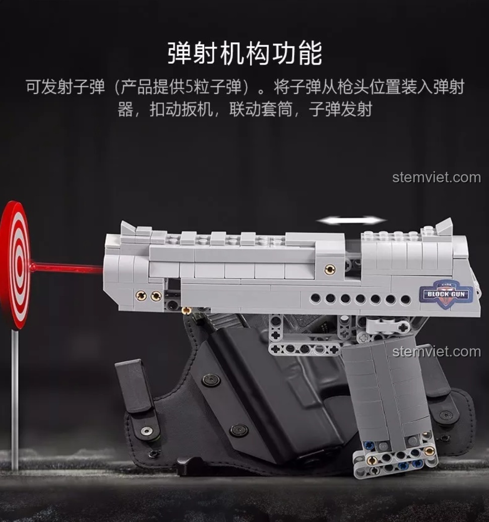Bộ sản phẩm CaDA C81007 Súng Lục Desert Eagle đi kèm với 5 viên đạn nhựa màu đỏ để bé có thể trải nghiệm ngay tính năng bắn súng sau khi lắp ráp xong.