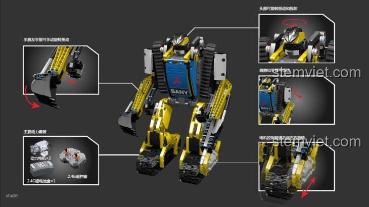 - Di chuyển linh hoạt: Bé có thể điều khiển robot/máy xúc tiến về phía trước, lùi lại, xoay trái, xoay phải một cách mượt mà trên nhiều địa hình nhờ hệ thống bánh xích mạnh mẽ.