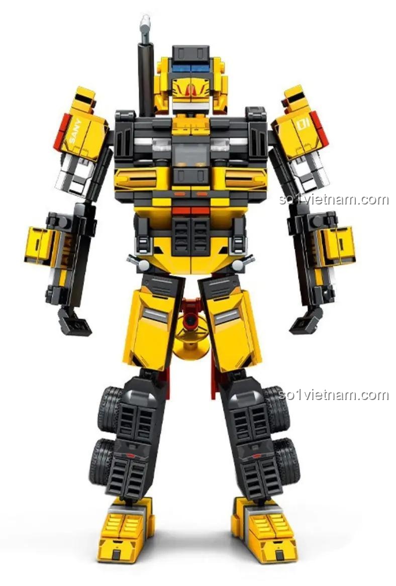 Sự hấp dẫn của bộ đồ chơi này nằm ở thiết kế thông minh, cho phép biến đổi giữa hai hình dạng hoàn toàn khác biệt. Ở dạng xe cẩu, mô hình tái hiện chân thực chiếc SANY STC800C6 với tông màu vàng-đỏ-đen đặc trưng của ngành xây dựng. Từng chi tiết từ cabin lái, hệ thống 10 bánh xe chắc chắn, đến cần cẩu dài vươn cao đều được chăm chút tỉ mỉ, mang lại cảm giác như một cỗ máy thật thu nhỏ. Chiếc xe dài gần 30cm, một kích thước hoàn hảo để bé cầm nắm và ‘điều khiển’ trên mọi địa hình trong nhà. Nhưng điều kỳ diệu chỉ thực sự bắt đầu khi bé bắt tay vào ‘biến hình’. Chỉ với vài bước lắp ráp lại, chiếc xe cẩu hiền lành bỗng chốc lột xác thành một Robot chiến đấu oai vệ. Dáng đứng vững chãi, các khớp tay chân linh hoạt, bộ giáp hầm hố được tạo nên từ chính những bộ phận của xe cẩu, tất cả tạo nên một hình tượng anh hùng mà bất kỳ cậu bé nào cũng ao ước. Đây không chỉ là một món đồ chơi, mà là hai trải nghiệm, hai câu chuyện trong cùng một sản phẩm.