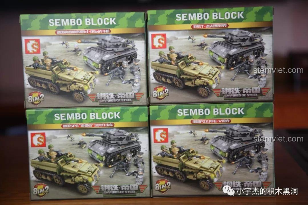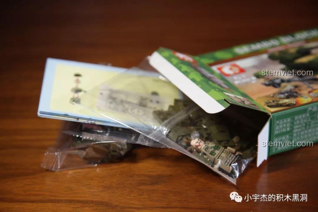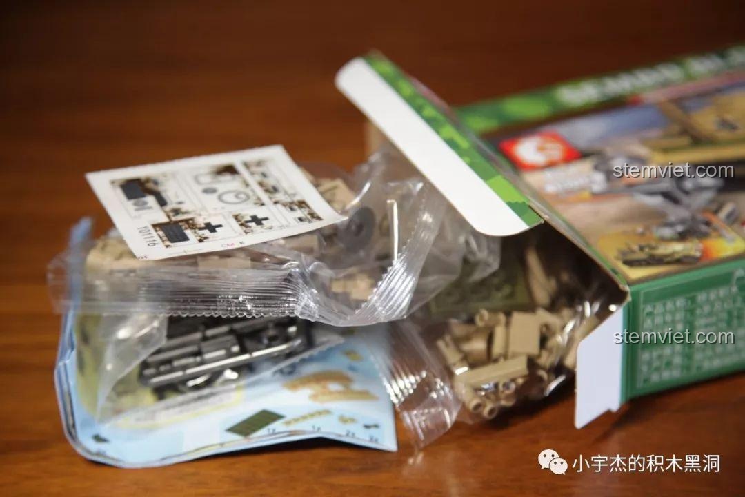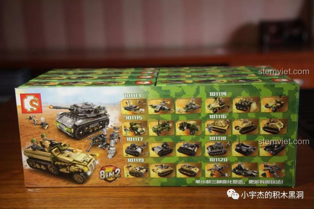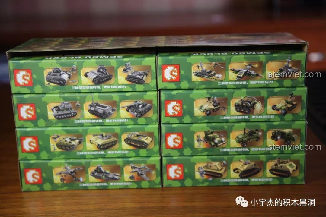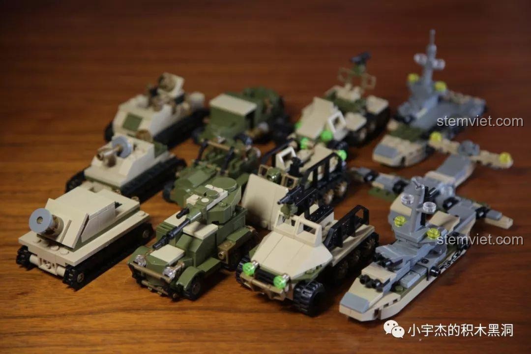 Điểm đặc biệt nhất của bộ đồ chơi SEMBO 101119 chính là sự đa dạng đến kinh ngạc. Bộ sưu tập bao gồm 8 hộp nhỏ, mỗi hộp là một phương tiện quân sự đặc trưng với màu sắc và thiết kế riêng biệt: màu vàng cát sa mạc cho những chiếc xe tăng Đức, màu xanh rêu ngụy trang cho các phương tiện của Liên Xô, và màu xám hạm đội cho tàu chiến Anh. Mỗi chi tiết, từ bánh xích, nòng pháo, đến các lớp giáp đều được tái hiện một cách tỉ mỉ. Đi kèm là 8 minifigure binh lính với quân phục đặc trưng của từng quốc gia, giúp bé dễ dàng phân biệt và xây dựng các kịch bản chiến đấu. Với hơn 900 mảnh ghép, bé không chỉ lắp ráp các mô hình riêng lẻ mà còn có thể hợp thể chúng thành những cỗ máy chiến tranh khổng lồ, tạo nên một đội quân hùng mạnh và độc đáo.