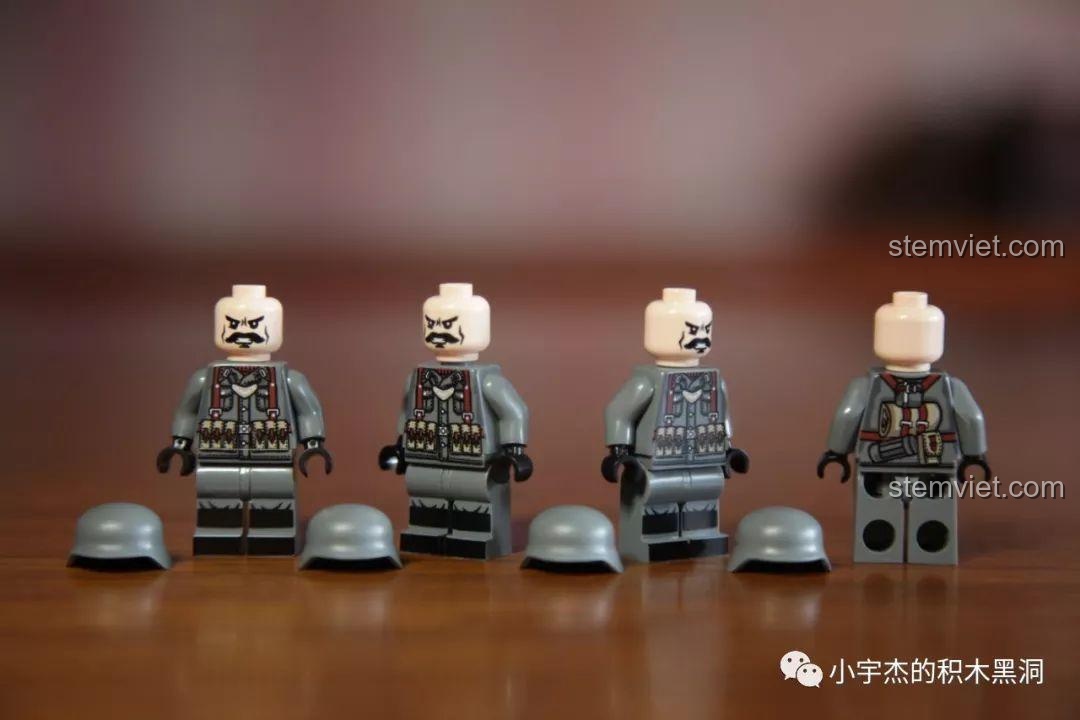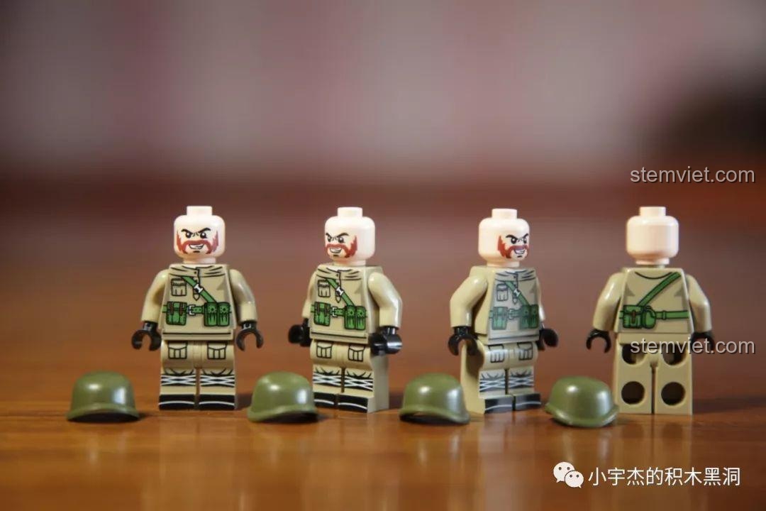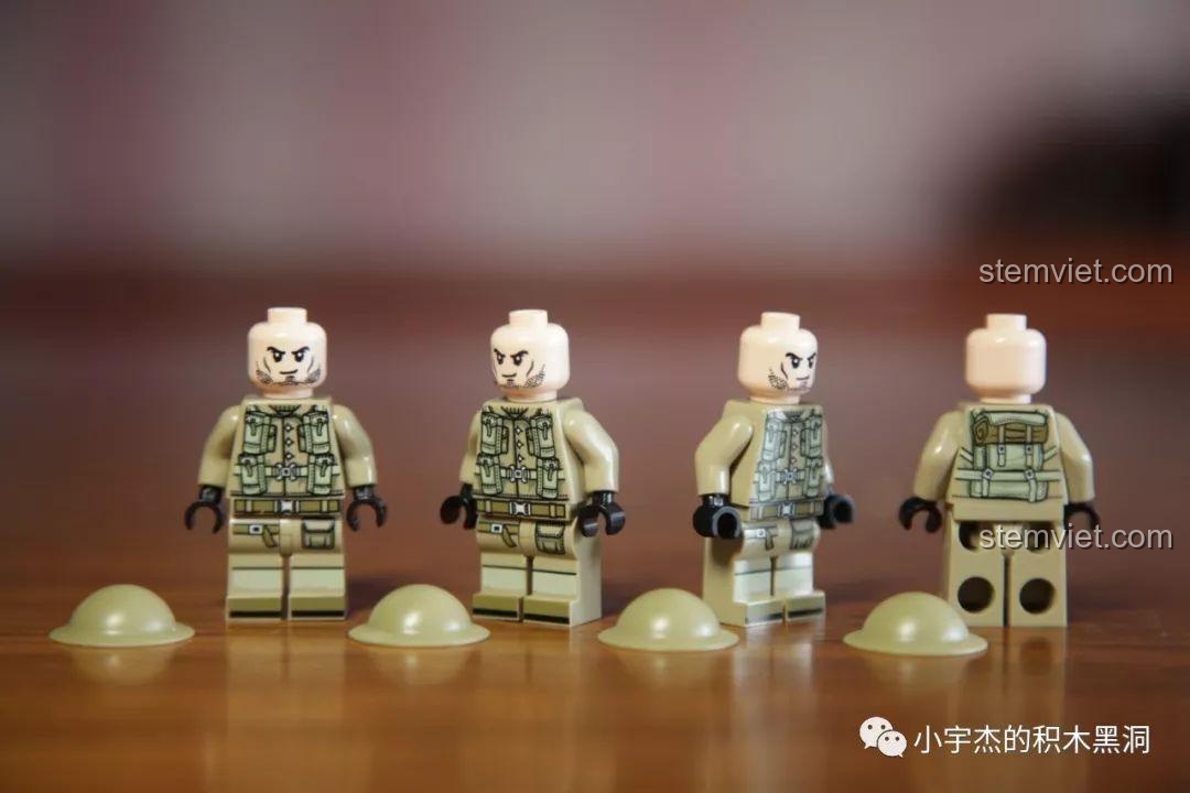 Mỗi một trong 8 hộp nhỏ đều đi kèm với 1 minifigure lính được trang bị vũ khí, với quân phục đặc trưng cho từng loại phương tiện. Vì vậy, khi sở hữu trọn bộ, bé sẽ có một đội quân gồm 8 binh lính.