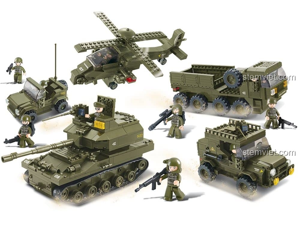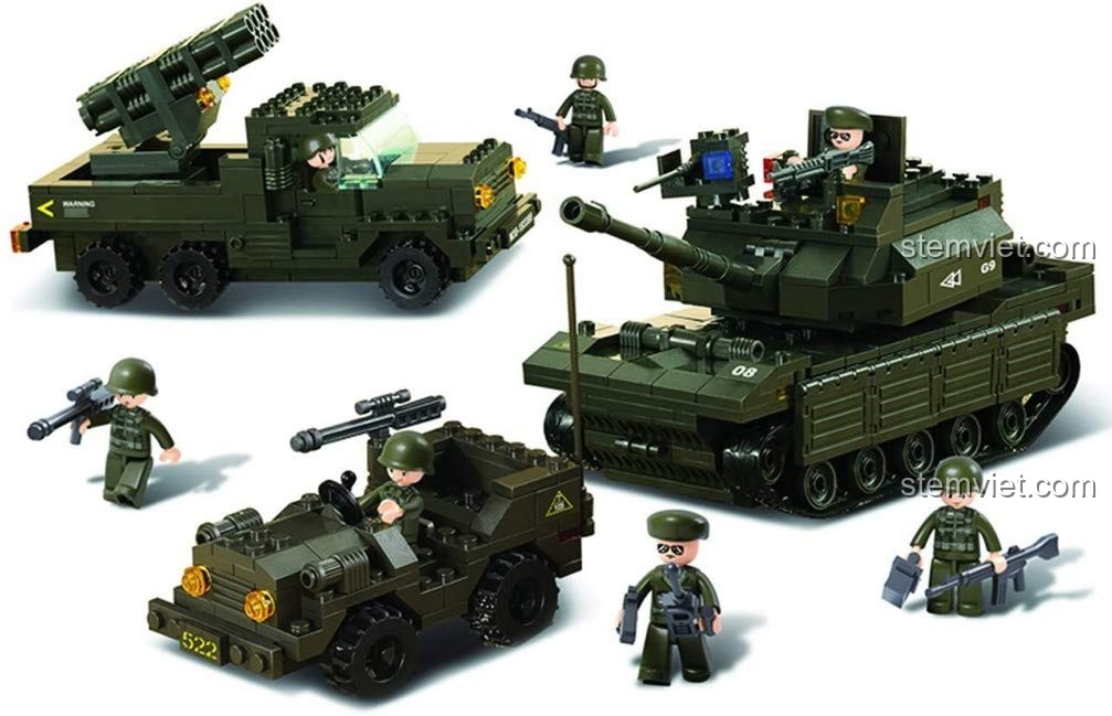 • Xe Bọc Thép và Xe Jeep: Hai phương tiện trinh sát và tuần tra không thể thiếu, với thiết kế nhỏ gọn, cơ động, được trang bị vũ khí và các chi tiết đặc trưng như ăng-ten, lốp dự phòng, mang lại sự đa dạng trong các kịch bản chiến đấu của bé.