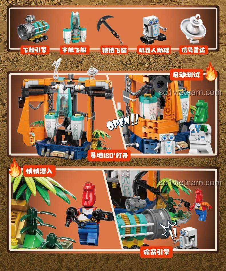 Điểm nhấn làm nên sự khác biệt của Trạm không gian bí ẩn Kalos Blocks chính là các tính năng tương tác đầy thú vị. Cơ chế bản lề thông minh cho phép toàn bộ căn cứ mở ra một góc 180 độ, không chỉ để dễ dàng chiêm ngưỡng nội thất mà còn tạo ra một sân khấu rộng lớn cho các cuộc đối đầu kịch tính. Bạn có thể tái hiện lại cảnh người Matren lén lút đột nhập vào căn cứ. Tính năng đặc biệt nhất chính là bộ tời xích hoạt động được. Hãy điều khiển minifigure Matren móc vào động cơ tàu vũ trụ và từ từ kéo nó ra khỏi bệ phóng! Liệu người Keron và Badan có kịp thời phát hiện và ngăn chặn âm mưu phá hoại này? Ngoài ra, bộ sản phẩm còn có một robot trợ lý nhỏ và các phụ kiện như radar, công cụ… để tăng thêm phần sống động cho câu chuyện của bạn.