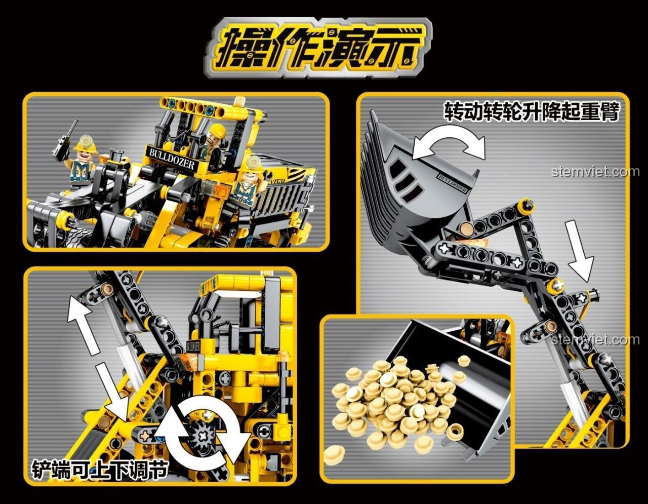 Điều làm nên sự khác biệt của Xe Xúc Lật SEMBO 701701 không chỉ nằm ở vẻ ngoài mà còn ở hệ thống cơ khí Technic đầy thú vị bên trong. Đây không phải là một mô hình tĩnh nhàm chán, mà là một cỗ máy có thể hoạt động thực sự. Thông qua các núm xoay được bố trí khéo léo trên thân xe, bé có thể điều khiển toàn bộ hệ thống tay xúc: