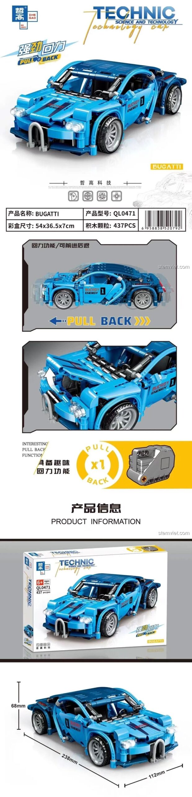 Trải Nghiệm Có Động Cơ Kéo Lùi Với bộ lắp ráp Zhegao QL0471 Siêu xe Bugatti Xanh Dương (437 mảnh ghép)