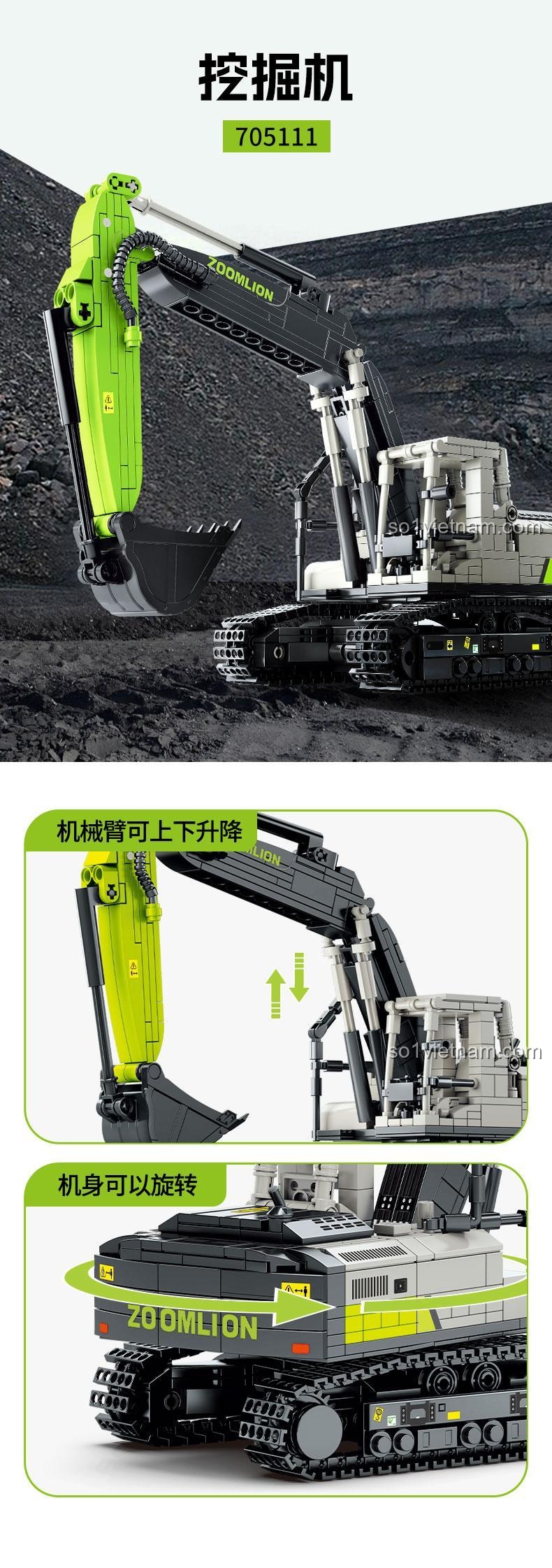 Điều làm nên sức hấp dẫn của bộ khối lắp ghép 705111 không chỉ nằm ở vẻ ngoài mà còn ở khả năng vận hành đáng kinh ngạc. Sau khi hoàn thành, bé sẽ không khỏi trầm trồ trước những gì ’em nó’ có thể làm được. Cánh tay máy xúc với nhiều khớp nối có thể nâng lên, hạ xuống, vươn ra xa hay gập lại một cách linh hoạt. Gầu xúc có thể điều khiển để thực hiện các thao tác múc, xúc, đổ đất đá như một chiếc máy xúc thật. Đặc biệt, toàn bộ thân trên của máy xúc có thể xoay tròn 360 độ trên bộ xích vững chãi, cho phép bé dễ dàng thao tác ở mọi hướng. Bộ xích cũng có thể di chuyển trơn tru trên mặt phẳng, giúp bé ‘lái’ cỗ máy của mình đi khắp công trường tưởng tượng. Tất cả những chuyển động cơ học này được thực hiện hoàn toàn bằng tay thông qua các núm xoay và khớp nối, giúp bé hiểu rõ hơn về nguyên lý hoạt động của máy móc.