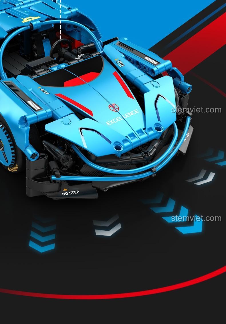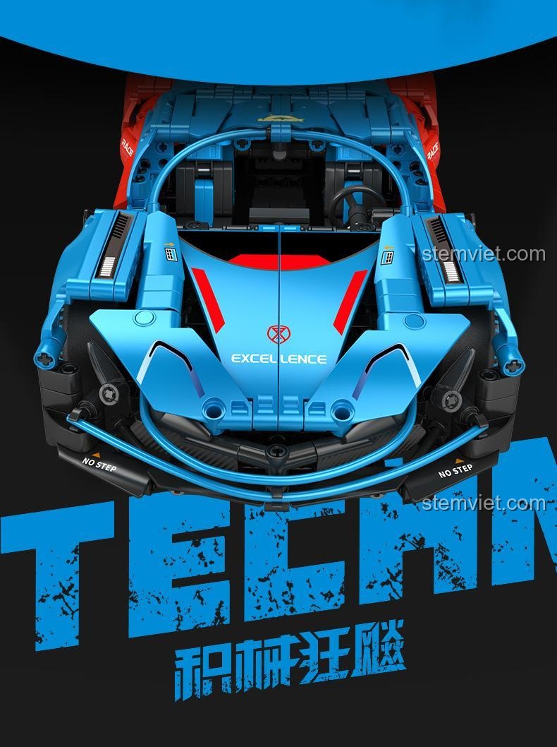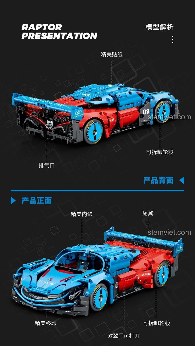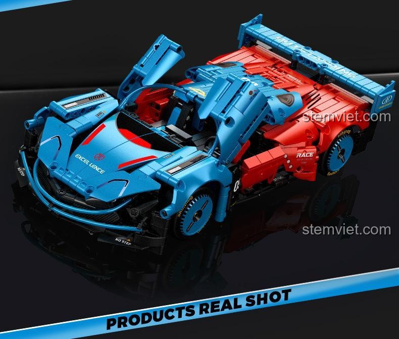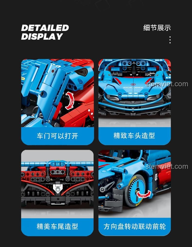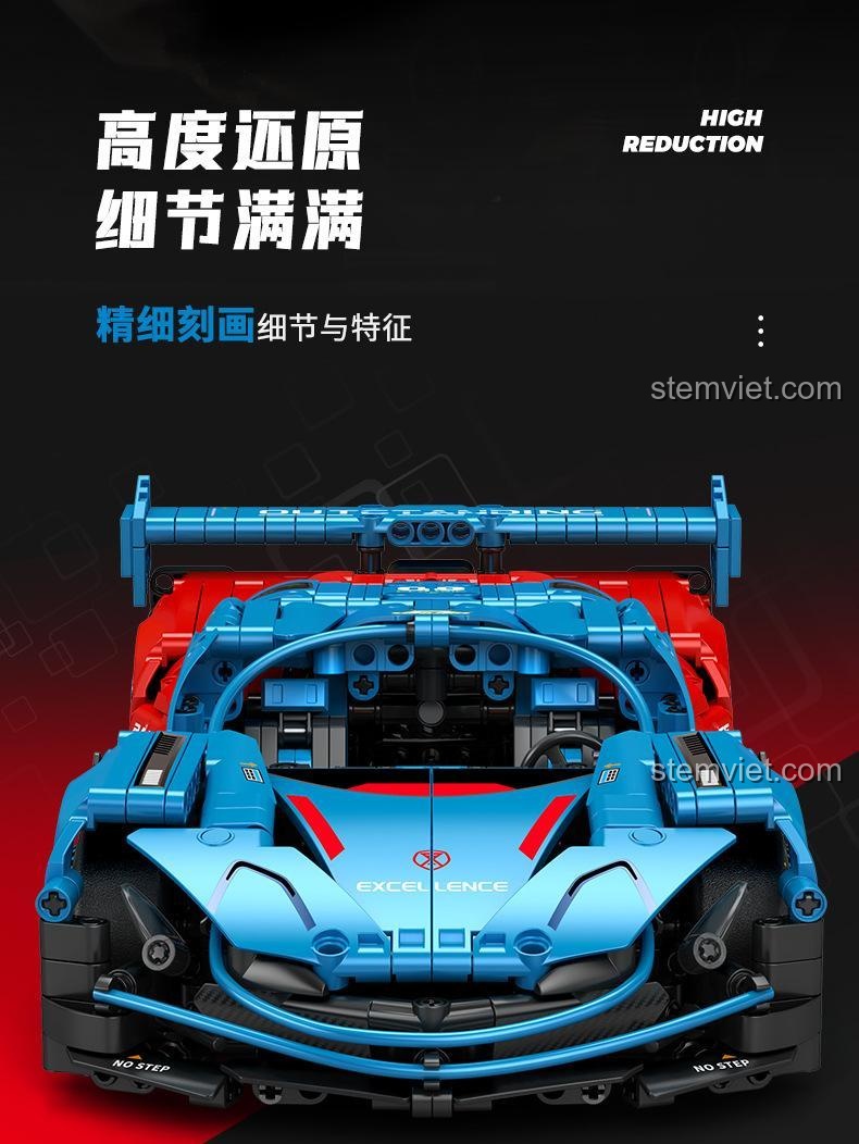 Bộ lắp ráp SEMBO 715004 Mazda Furai nổi bật với thiết kế tỉ mỉ và độ chính xác cao, tái hiện gần như hoàn hảo chiếc xe concept ngoài đời thực. Với tỉ lệ 1:14 ấn tượng, mô hình này có chiều dài 32.4 cm, chiều rộng 16.4 cm và chiều cao 8.3 cm, mang đến một kích thước vừa vặn để trưng bày hoặc chơi đùa. Màu sắc chủ đạo là xanh dương và đỏ, tạo nên vẻ ngoài năng động và mạnh mẽ, đúng chất của một chiếc xe đua Mazda Furai. Từ phần đầu xe tinh tế, đuôi xe đẹp mắt với cánh gió lớn, cho đến nội thất tinh xảo với vô lăng có thể liên kết điều khiển bánh trước, mọi chi tiết đều được chăm chút kỹ lưỡng. Đặc biệt, tính năng cửa cánh chim độc đáo có thể mở lên một góc 45 độ, mang lại trải nghiệm chân thực và ấn tượng như siêu xe thật. Đây thực sự là một đồ chơi mô hình 004 mà mọi bé trai đam mê xe cộ đều mơ ước.