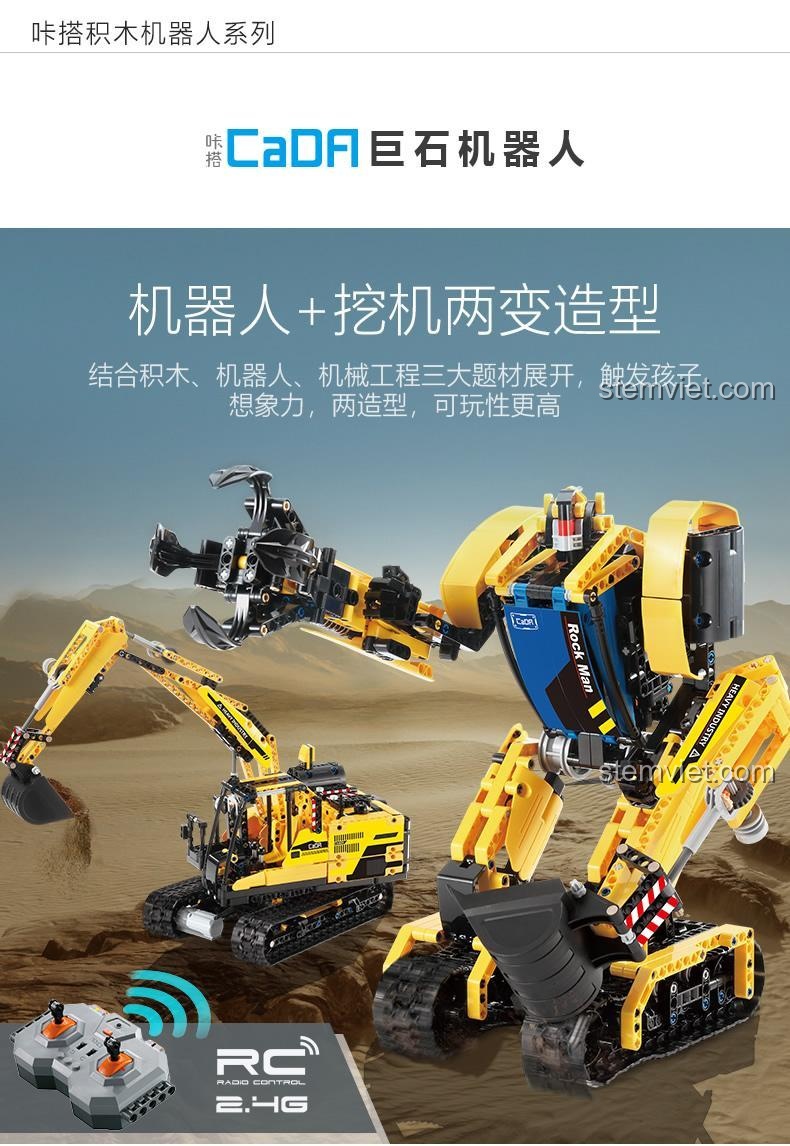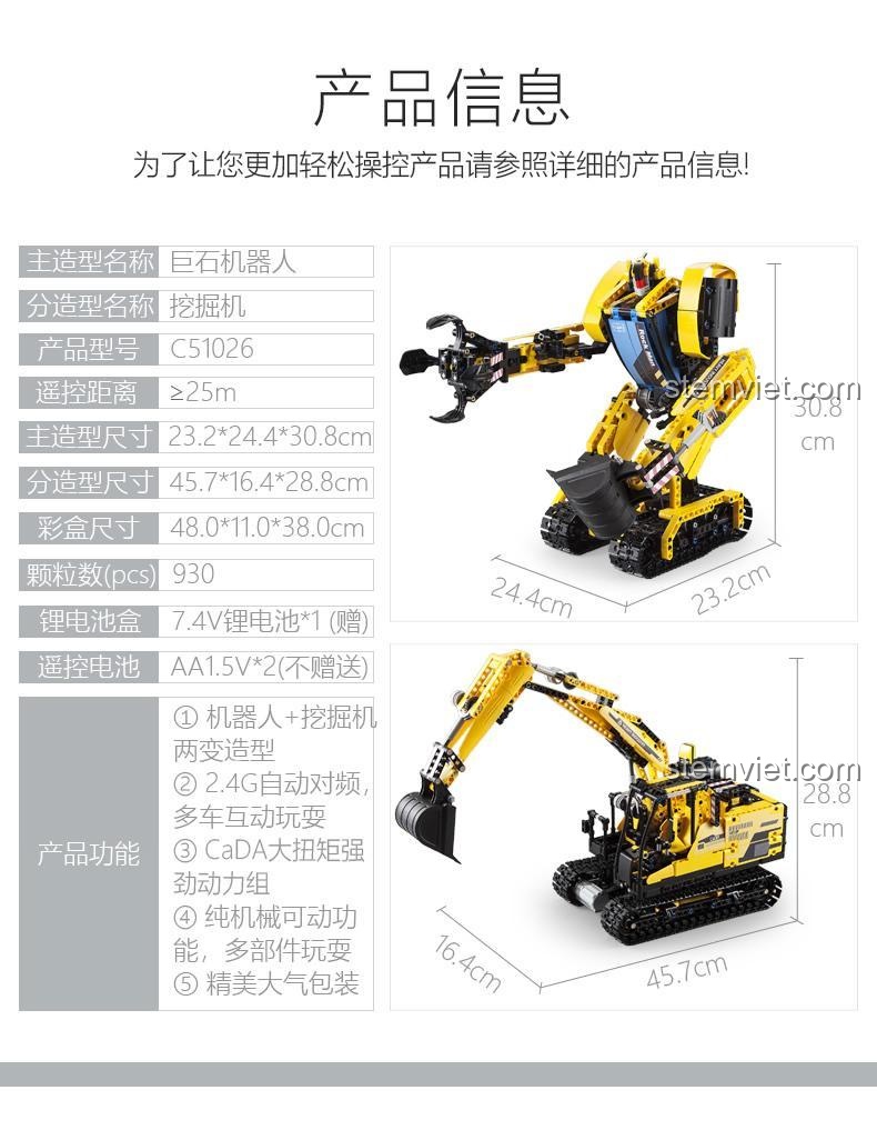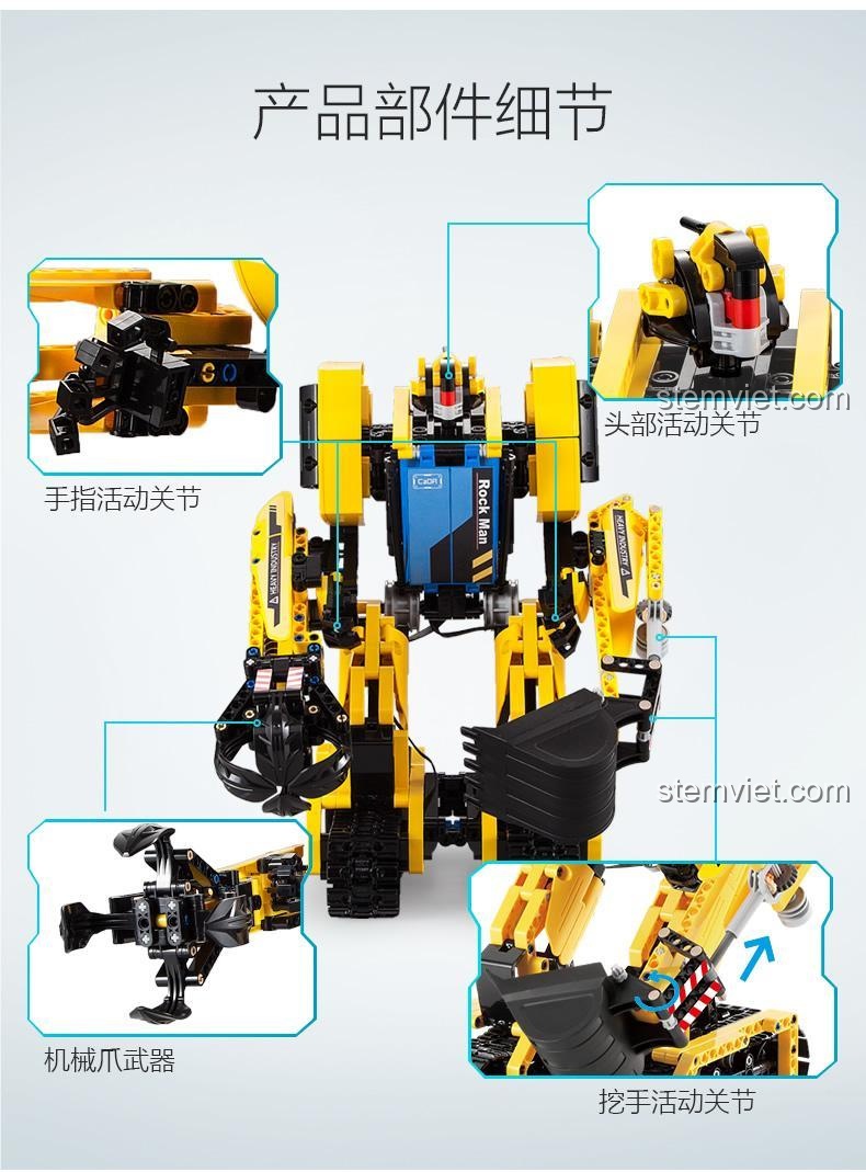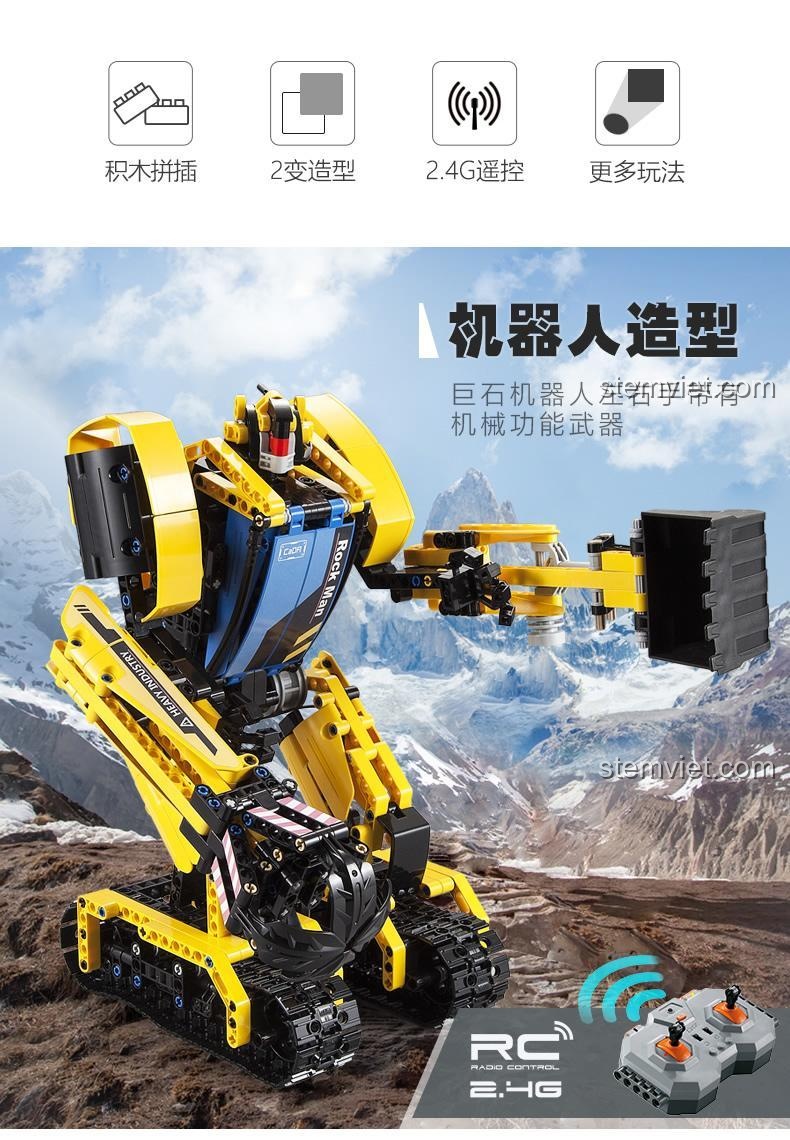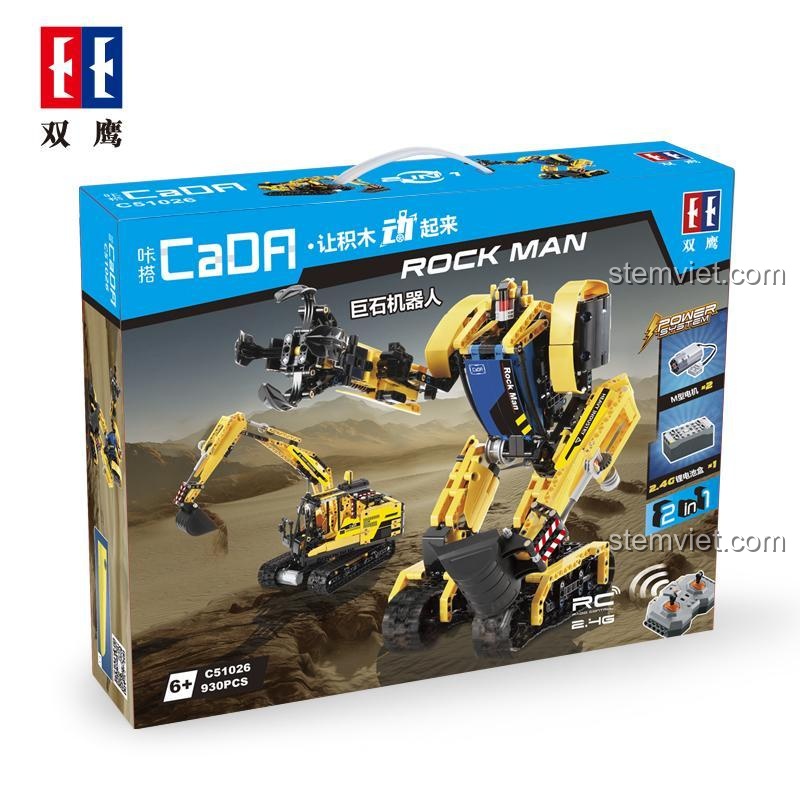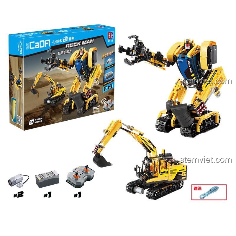 Đồ chơi mô hình CaDA C51026 là một tuyệt tác thiết kế, kết hợp hoàn hảo giữa hai thế giới: sức mạnh công trình và robot chiến đấu. Ở dạng máy xúc, mô hình gây ấn tượng với chiều dài lên tới 45.7 cm, khoác lên mình bộ áo vàng đen đặc trưng của ngành xây dựng, từng chi tiết từ gầu xúc, cần trục cho đến hệ thống bánh xích đều được tái hiện một cách chân thực. Nhưng điều kỳ diệu chỉ thực sự bắt đầu khi 930 mảnh ghép được sắp xếp lại. Chiếc máy xúc biến hình thành Robot Rock Man oai vệ, cao 30.8 cm, với dáng đứng vững chãi, các khớp tay, chân, đầu linh hoạt và đôi tay được trang bị vũ khí cơ khí đầy uy lực. Mỗi góc cạnh của cả hai mô hình đều toát lên vẻ mạnh mẽ, tinh xảo, một minh chứng cho sự sáng tạo không giới hạn từ những khối lắp ghép Technic.