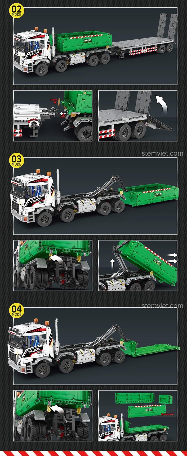 Bộ Reobrix bộ lắp ráp này có khả năng biến hình thành 4 chế độ khác nhau: xe tải móc cẩu, xe tải kéo rơ moóc phẳng, xe tải ben và xe tải vận chuyển container, mang đến sự đa dạng trong cách chơi và khám phá.