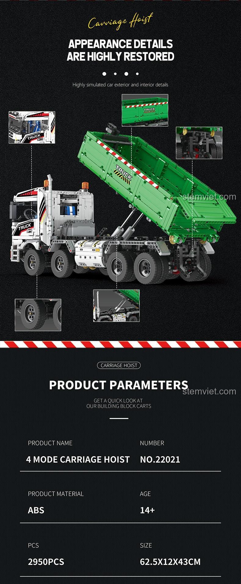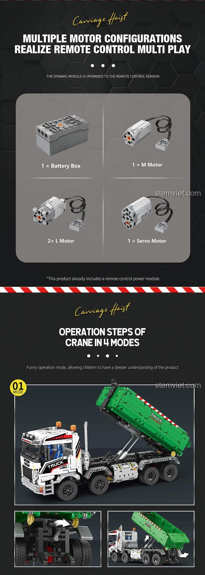 Tính năng nổi bật nhất là khả năng Lắp Được 4 Kiểu khác nhau, biến hóa linh hoạt từ xe tải móc cẩu, xe tải kéo rơ moóc phẳng, xe tải ben cho đến xe tải vận chuyển container. Mỗi chế độ đều được thiết kế với cơ chế hoạt động riêng biệt, mô phỏng chân thực các chức năng của xe chuyên dụng ngoài đời thực. Hệ thống móc cẩu hoạt động trơn tru, hệ thống ben tự động nâng hạ thùng xe một cách mượt mà, và hệ thống kéo rơ moóc cho phép vận chuyển các mô hình khác, mở ra vô vàn kịch bản chơi sáng tạo.