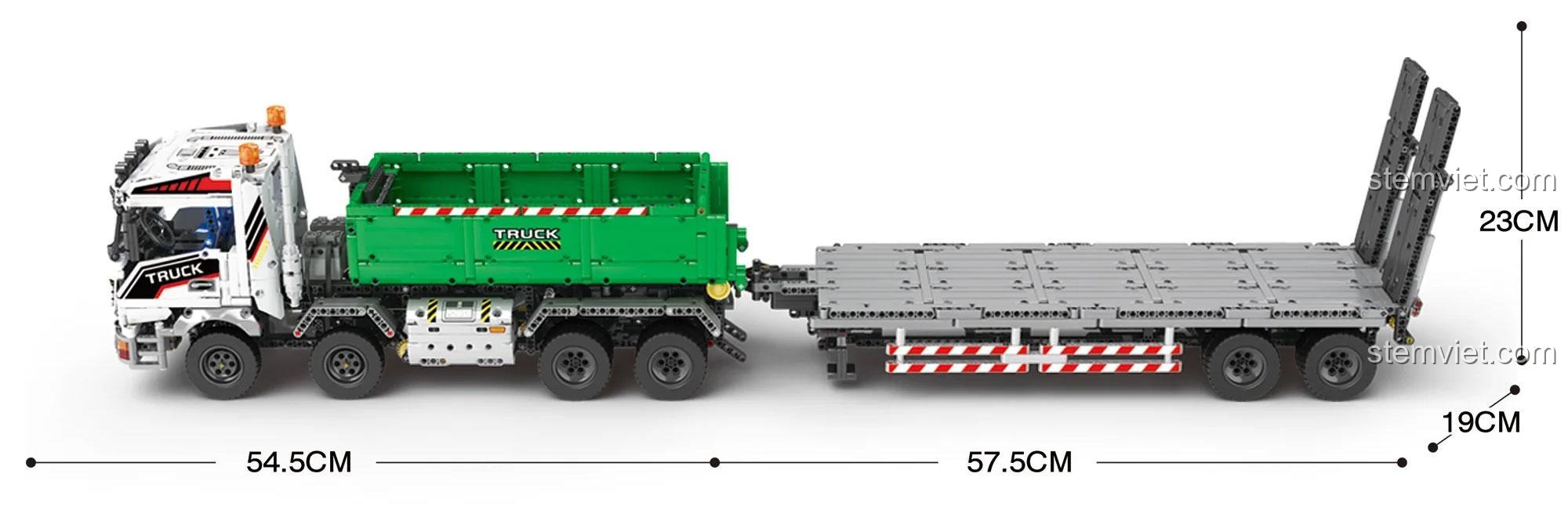 Ngay từ cái nhìn đầu tiên, Reobrix bộ lắp ráp 22021 đã gây ấn tượng mạnh mẽ với thiết kế vô cùng chân thực và tỉ mỉ. Với tổng chiều dài lên đến 112 cm, chiều rộng 19 cm và chiều cao 23 cm, đây là một mô hình xe tải khổng lồ, tái hiện hoàn hảo từng đường nét của một chiếc xe chuyên dụng ngoài đời thực. Sự kết hợp hài hòa giữa các màu sắc chủ đạo như Trắng, Xanh lá, Xám và Đen tạo nên vẻ ngoài mạnh mẽ, hiện đại và đầy cuốn hút.