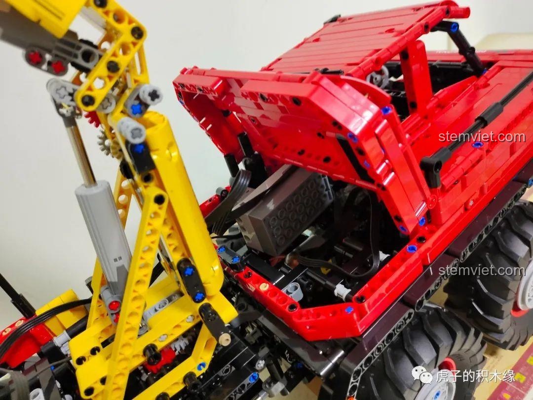 - Hệ thống dẫn động 8×8: Tất cả 8 bánh xe đều có khả năng truyền động, giúp Xe Tải Vận Chuyển Gỗ Khớp Nối Mould King 13146 vượt qua các chướng ngại vật một cách dễ dàng, thể hiện khả năng offroad xuất sắc.