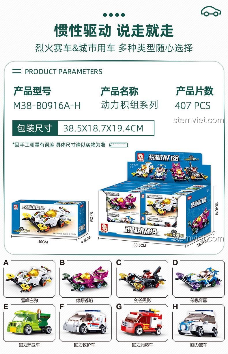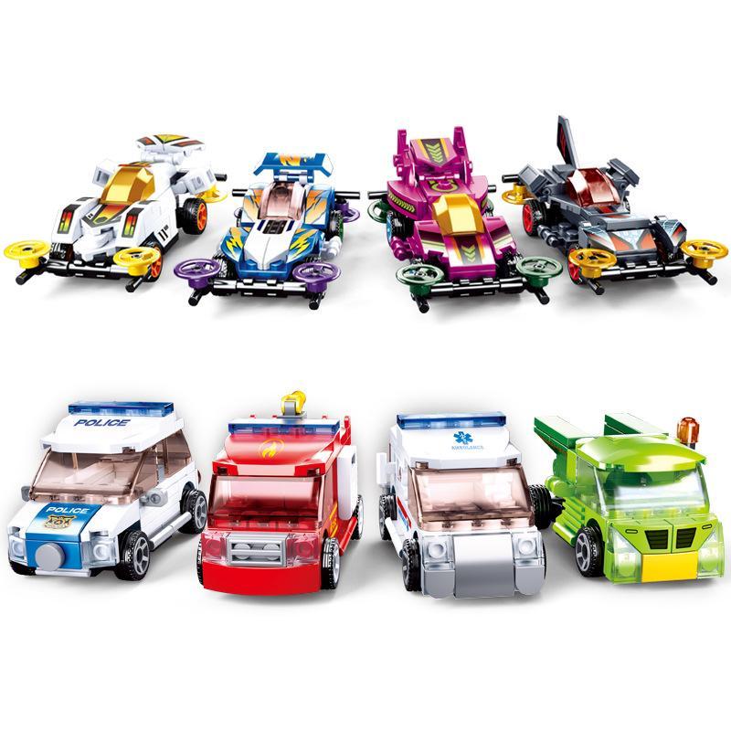 Điểm đặc biệt nhất của đồ chơi xếp hình Sluban M38-B0916 chính là sự đa dạng trong một bộ sản phẩm. Với 407 mảnh ghép, bé có thể tạo ra đến 8 mô hình xe hoàn toàn khác biệt, mỗi chiếc mang một cá tính riêng. Bốn mẫu xe thành phố được thiết kế chân thực: xe cảnh sát oai vệ với hai màu trắng-xanh dương, xe cứu hỏa nổi bật với sắc đỏ, xe cứu thương trắng tinh khôi và xe vệ sinh màu xanh lá thân thiện. Bốn mẫu xe đua còn lại là một bản giao hưởng của màu sắc và trí tưởng tượng: từ “Bạch Mã Tuyết Phong” trắng muốt, “Thương Diễm Thảo Nguyên” tím hồng cá tính, “Hắc Ảnh Kiếm Cốc” đen đỏ bí ẩn, đến “Bôn Lôi Gầm Thét” xanh tím mạnh mẽ. Mỗi chiếc xe đều được trang bị động cơ kéo lùi (pull-back) mạnh mẽ, chỉ cần kéo nhẹ về sau và thả tay, chiếc xe sẽ lao đi vun vút, mang lại những trải nghiệm đua xe đầy phấn khích. Kích thước trung bình mỗi xe khoảng 12cm, vừa vặn với bàn tay nhỏ của bé, giúp con dễ dàng cầm nắm và vui chơi.
