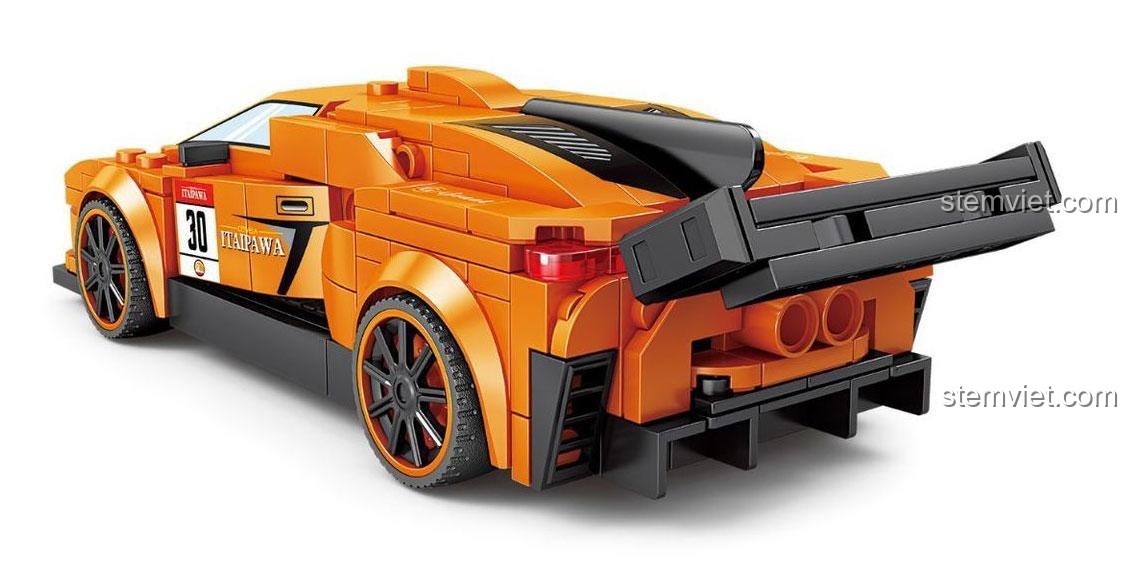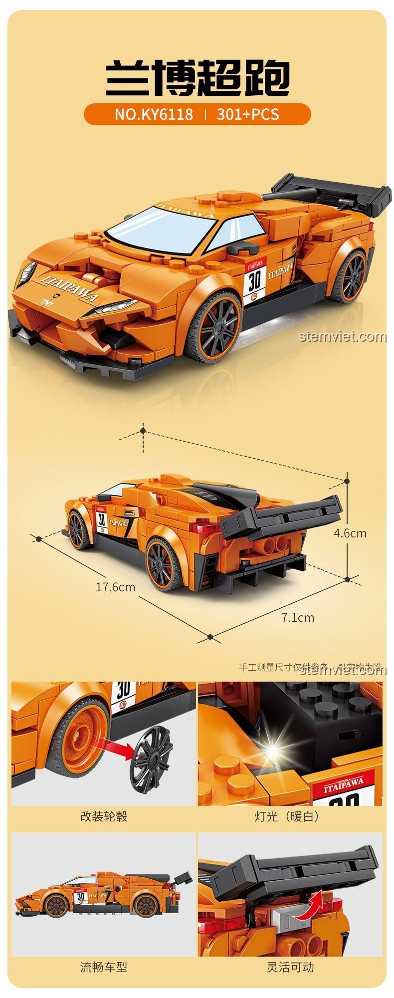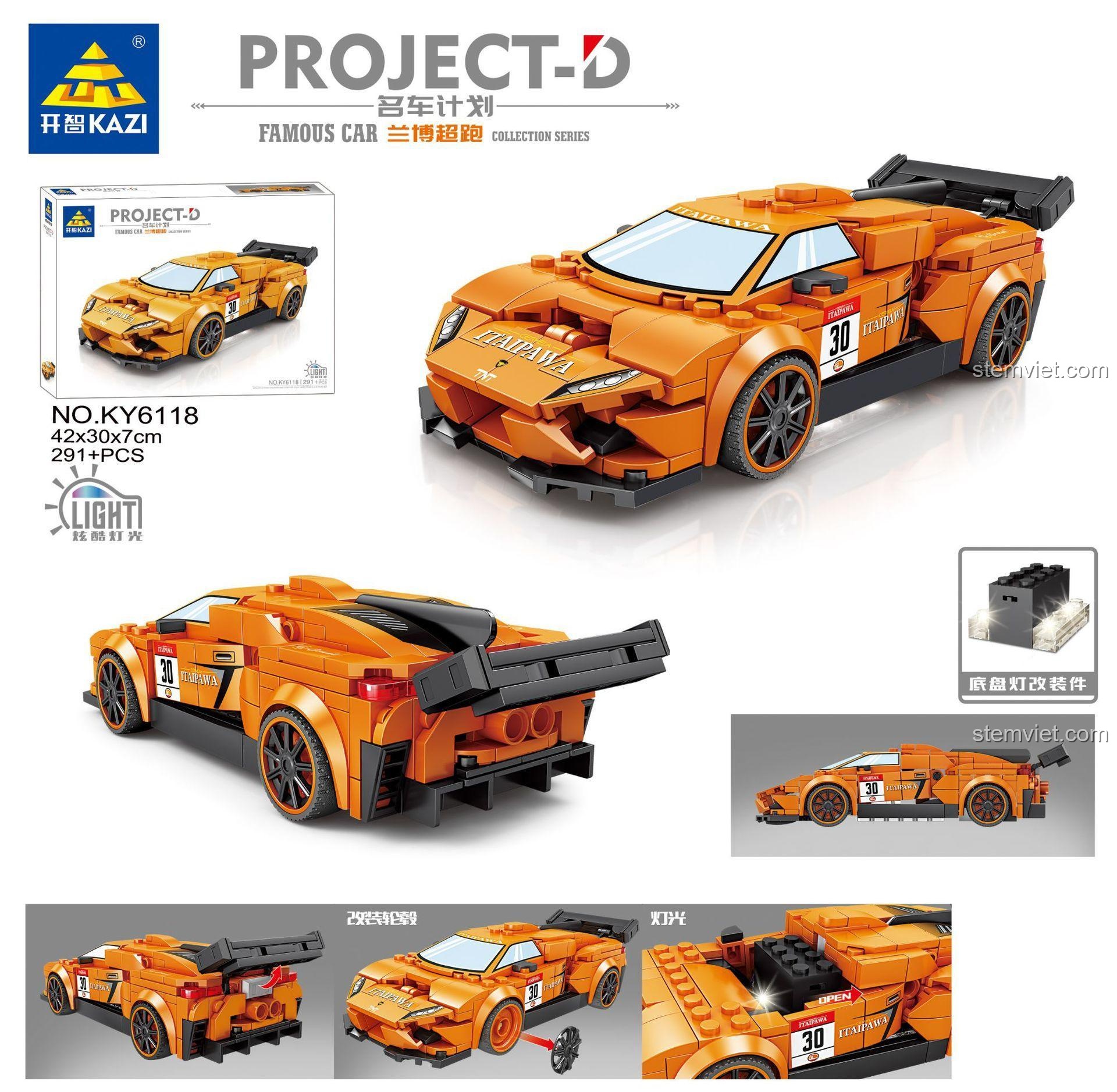 Ngay từ cái nhìn đầu tiên, Mô hình Lamborghini Project-D KY6118 đã chinh phục mọi ánh nhìn bằng màu cam rực rỡ, đầy năng lượng, kết hợp hoàn hảo với các chi tiết màu đen mạnh mẽ, tạo nên một tổng thể hài hòa và cực kỳ thể thao. Từng đường nét trên thân xe được tái hiện một cách tỉ mỉ, từ hốc hút gió hầm hố phía trước, nắp capo góc cạnh cho đến phần đuôi xe với cánh gió lớn và cụm ống xả kép đầy uy lực. Với kích thước dài 17.6 cm, rộng 7.1 cm và cao 4.6 cm sau khi hoàn thành, mô hình có tỷ lệ cân đối, vừa vặn để bé cầm nắm và chơi đùa. Các chi tiết như bộ mâm xe đa chấu, logo “ITAIPAWA” và số hiệu “30” trên thân xe càng làm tăng thêm vẻ chuyên nghiệp của một chiếc xe đua thực thụ. Đây không chỉ là một món đồ chơi, mà còn là một vật trang trí tuyệt đẹp cho góc học tập của bé, một niềm tự hào mà bé có thể khoe với bạn bè.