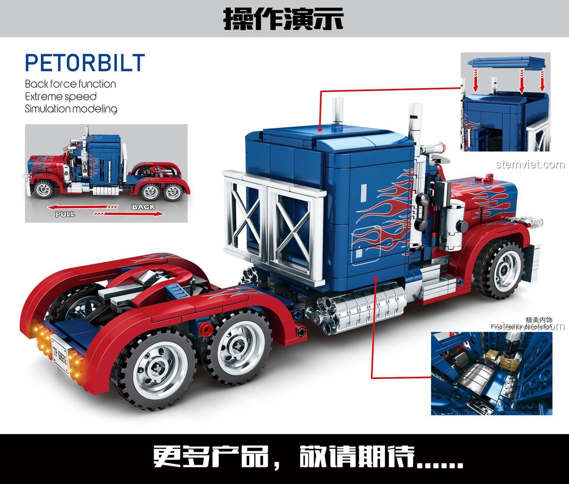 Bộ lắp ráp Xe Tải Peterbilt 389 SEMBO 701803 không chỉ là một mô hình tĩnh mà còn mang đến những tính năng tương tác thú vị, nâng cao trải nghiệm chơi của bé. Điểm nhấn nổi bật nhất chính là động cơ kéo lùi mạnh mẽ được tích hợp sẵn. Chỉ cần kéo xe lùi lại và thả ra, chiếc xe tải Peterbilt 389 sẽ lao về phía trước với tốc độ ấn tượng, mang đến những màn đua xe đầy kịch tính và phấn khích. Tính năng này không chỉ giúp bé giải trí mà còn giúp bé hiểu hơn về nguyên lý cơ học đơn giản. Bên cạnh đó, mô hình còn được trang bị nội thất tinh xảo với các chi tiết mô phỏng chân thực như ghế lái, vô lăng, và khu vực nghỉ ngơi có giường, tủ, đèn. Các cánh cửa xe có thể mở ra, cho phép bé dễ dàng khám phá không gian bên trong và tạo ra những câu chuyện nhập vai sống động. Những tính năng này biến bộ đồ chơi mô hình Peterbilt 389 thành một trải nghiệm chơi đa chiều, kích thích trí tưởng tượng và sự sáng tạo của bé.