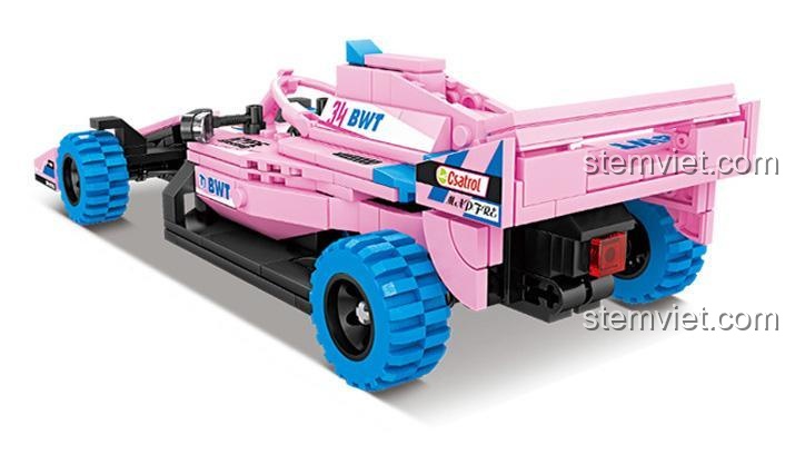 Ngoài tính năng kéo lùi, đồ chơi lắp ráp Mô hình xe đua F1 màu hồng còn có gì đặc biệt không?