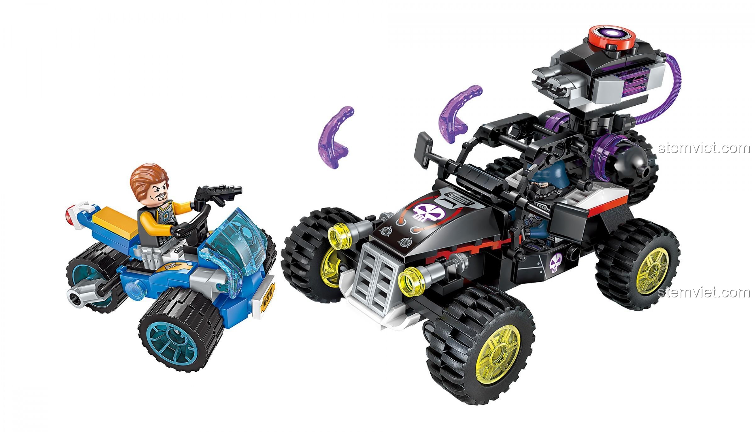 Ngay từ cái nhìn đầu tiên, đồ chơi mô hình QMAN 2707 đã chinh phục mọi cậu bé bởi vẻ ngoài cực ‘ngầu’. Chiếc Xe Chiến Đấu Dạ Ma khoác lên mình màu đen tuyền bí ẩn, điểm xuyết bằng các chi tiết màu tím năng lượng và vàng neon nổi bật, tạo nên một tổng thể vừa hầm hố, vừa hiện đại. Dáng xe buggy địa hình với bộ khung chắc chắn, gầm cao và bốn bánh xe gai góc khổng lồ sẵn sàng thách thức mọi địa hình hiểm trở. Đặc biệt, các họa tiết đầu lâu trên mui xe càng làm tăng thêm vẻ ma mị, đúng với cái tên ‘Dạ Ma’. Đối lập với nó là chiếc mô tô ba bánh của phe Đồng Minh, với tông màu xanh dương và vàng tươi sáng, thể hiện cho chính nghĩa và hy vọng. Kích thước của các mô hình sau khi lắp ráp rất vừa vặn cho bàn tay của trẻ 6 tuổi, giúp bé dễ dàng cầm nắm và điều khiển trong các kịch bản chiến đấu do chính mình tạo ra.