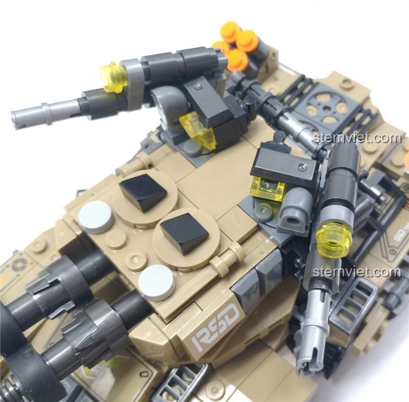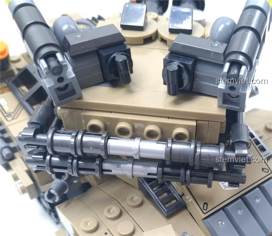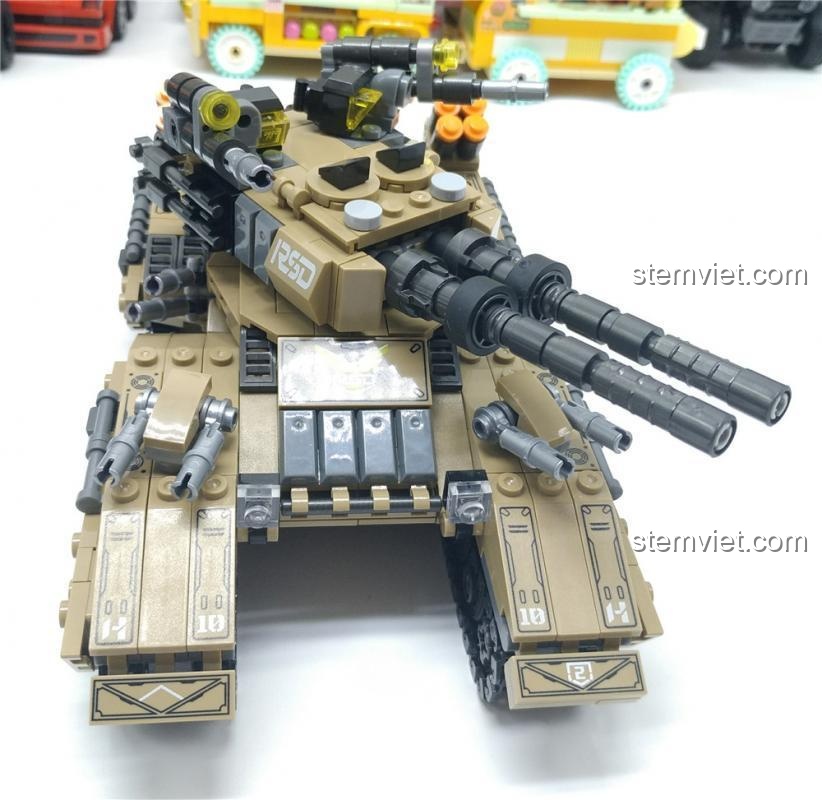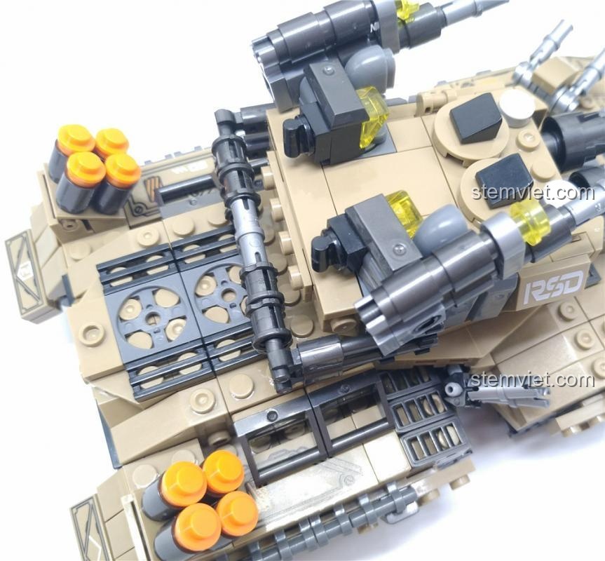 Ngay từ cái nhìn đầu tiên, Xe Tăng Hoàng Đế Mirage đã gây ấn tượng mạnh mẽ với vẻ ngoài cực kỳ hầm hố và chi tiết. Khoác lên mình màu sơn nâu cát sa mạc chủ đạo, kết hợp với các chi tiết xám và đen, mô hình toát lên vẻ rắn rỏi, sẵn sàng cho mọi trận chiến. Với kích thước sau khi lắp ráp là 21x11x10 cm, cỗ máy này thực sự là một gã khổng lồ trên bàn cờ chiến thuật của bé. Điểm nhấn đặc biệt là hệ thống 8 bánh xích độc đáo, chia thành 4 cụm riêng biệt, tạo nên một cấu trúc di chuyển linh hoạt và đầy uy lực. Tháp pháo chính được trang bị hai nòng pháo song song mạnh mẽ, cùng với vô số tháp pháo phụ, súng máy và dàn tên lửa phòng không, tất cả đều được bố trí một cách hợp lý, tạo nên một tổng thể hài hòa và đầy sức mạnh. Mọi chi tiết trên xe đều được in trực tiếp, sắc nét, không cần dán decal, giúp mô hình bền đẹp theo thời gian.