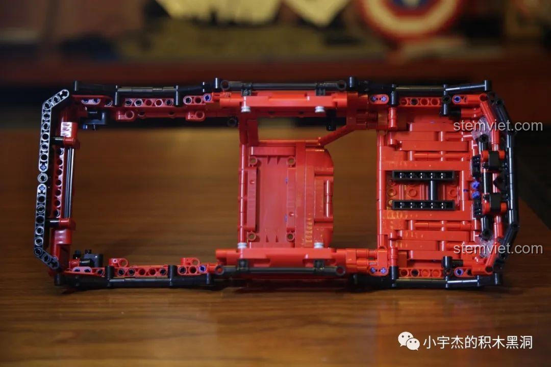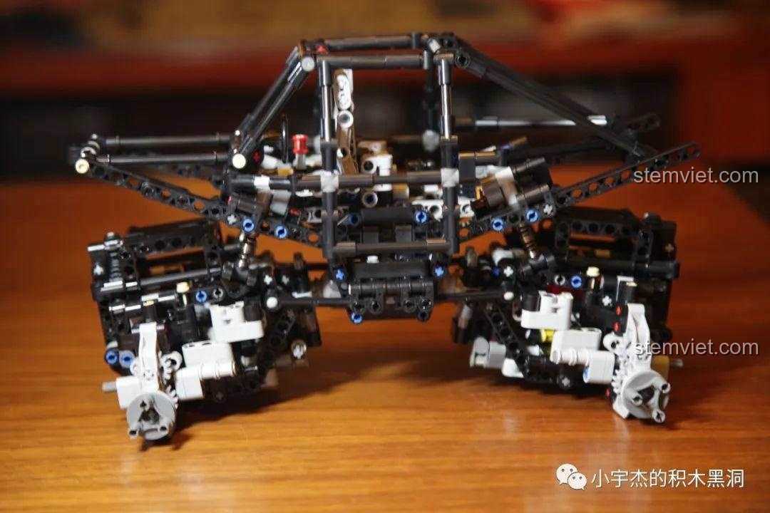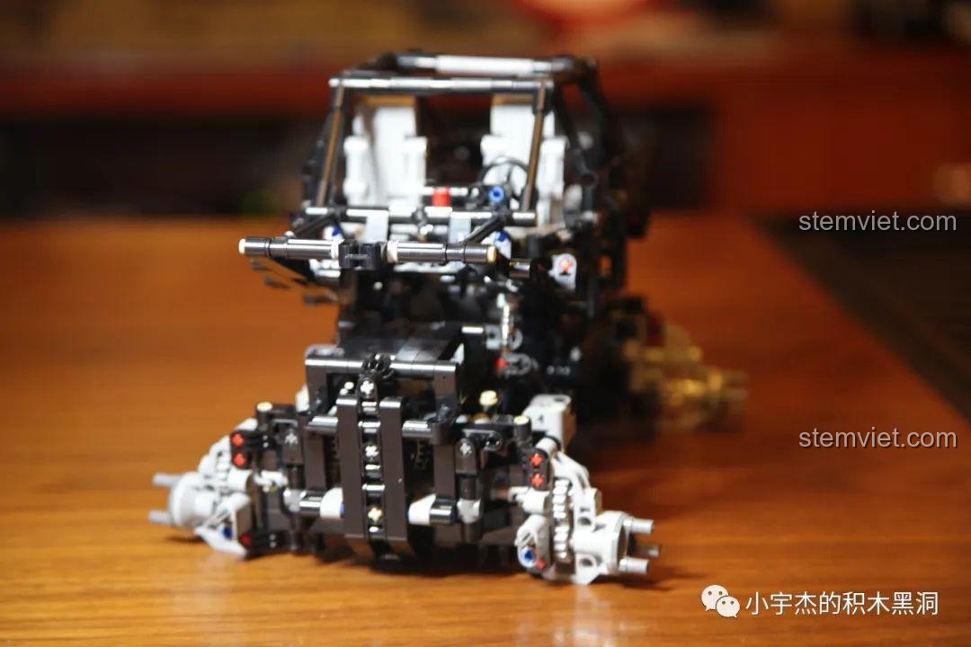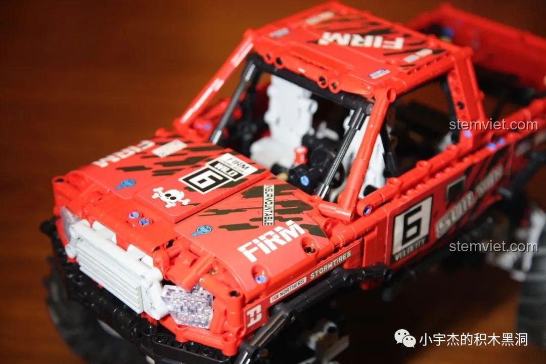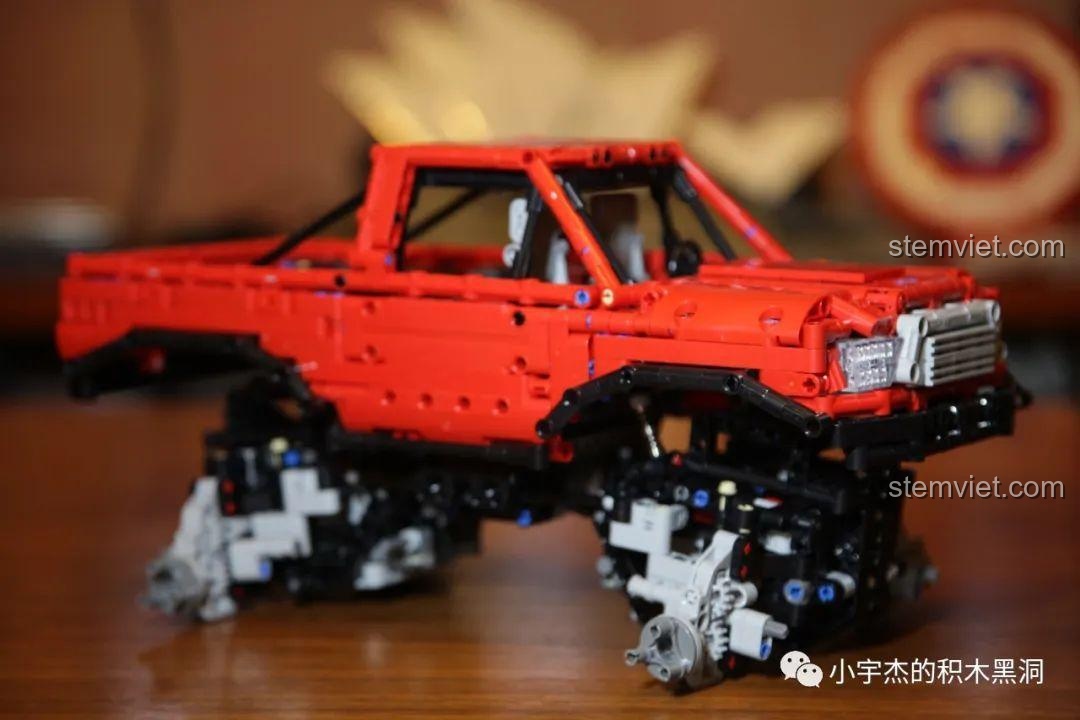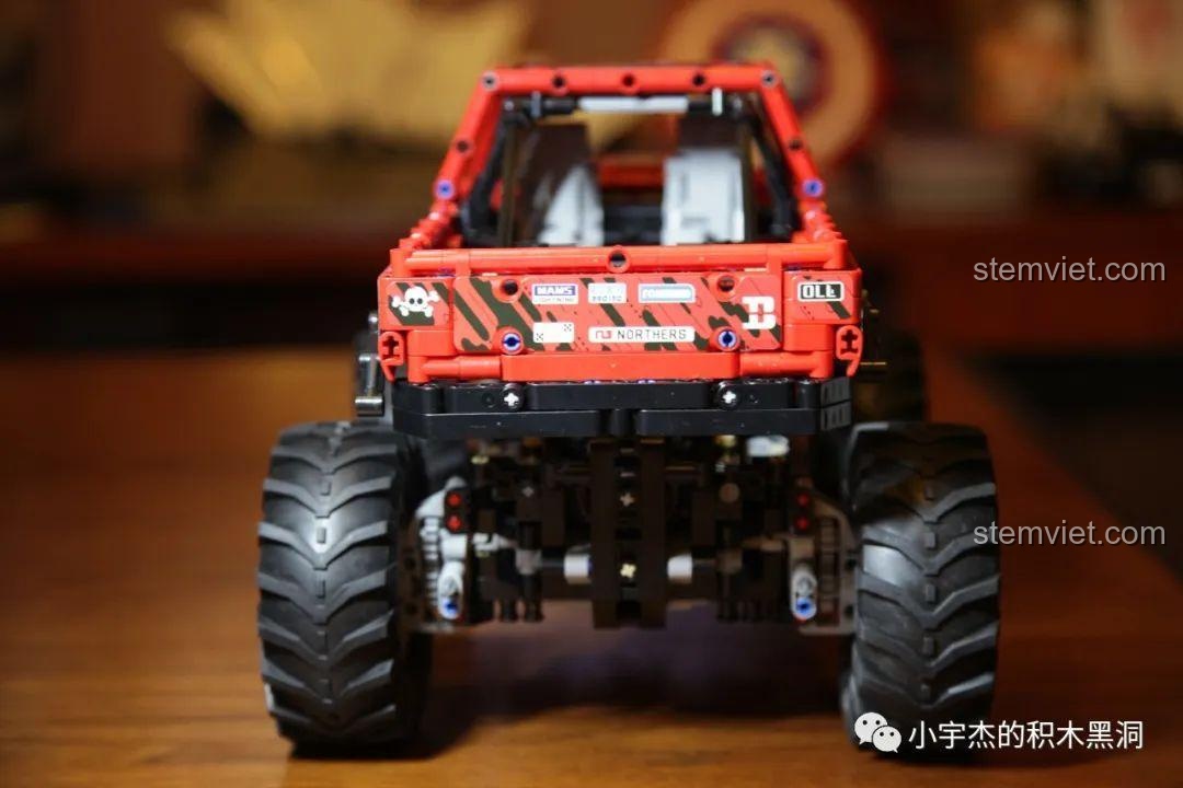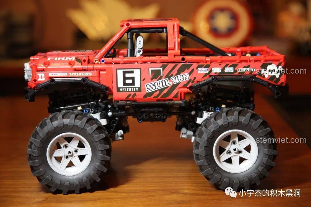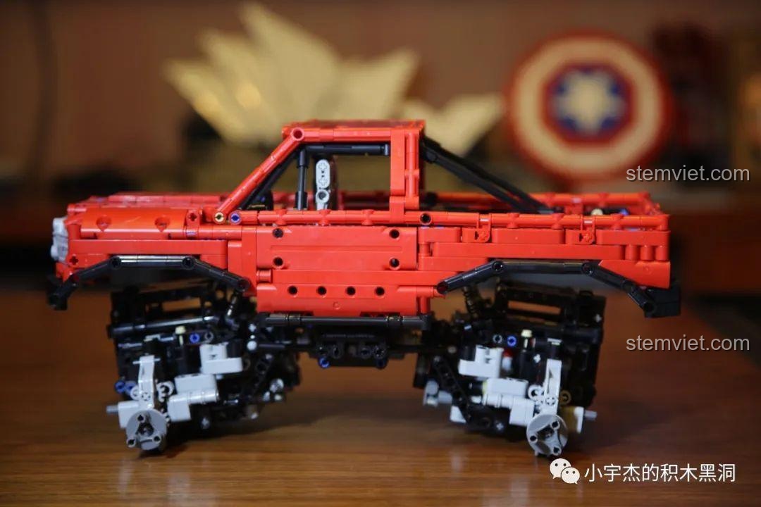 Với chiều dài lên tới 40.5 cm, đây là một mô hình có kích thước đáng nể, cầm rất đầm tay. Mọi chi tiết đều được tái hiện một cách tỉ mỉ, từ lưới tản nhiệt phía trước, hệ thống đèn pha, cho đến khung chống lật chắc chắn và thùng xe rộng rãi phía sau. Điểm nhấn không thể không nhắc tới chính là bốn chiếc bánh xe khổng lồ với gai lốp sâu, sẵn sàng bám trụ trên mọi bề mặt. Bên dưới lớp vỏ hào nhoáng là một bộ khung gầm Technic phức tạp, để lộ ra hệ thống treo, trục truyền động và các cơ cấu cơ khí tinh vi, mời gọi những ánh mắt tò mò khám phá. Đây không chỉ là một món đồ chơi, mà là một tác phẩm kỹ thuật thu nhỏ, hoàn hảo để trưng bày trong phòng của bất kỳ cậu bé nào.