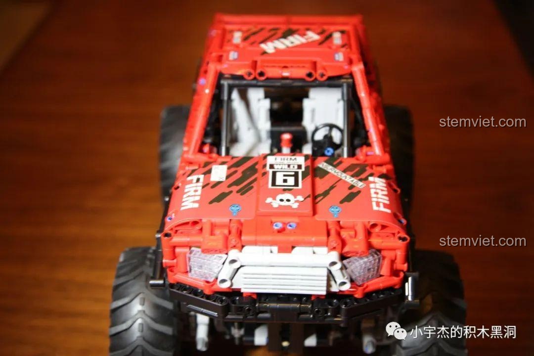 Ngay từ cái nhìn đầu tiên, Quái thú địa hình Xinyu XQ1212D đã gây ấn tượng mạnh mẽ với vẻ ngoài cực kỳ hầm hố và dữ dằn. Khoác lên mình bộ cánh màu đỏ rực lửa kết hợp với các chi tiết đen mạnh mẽ, chiếc xe toát lên một khí chất bất khả chiến bại. Bộ decal đi kèm với các họa tiết đầu lâu, số hiệu “6” và các dòng chữ “FIRM”, “WILD” càng làm tăng thêm vẻ ngầu và cá tính cho xe.