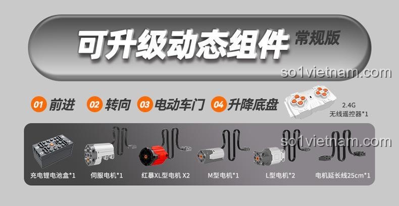 Bộ sản phẩm tiêu chuẩn không bao gồm các bộ phận điện tử. Tuy nhiên, nó được thiết kế để ‘sẵn sàng nâng cấp’. Bạn có thể mua thêm bộ động cơ và điều khiển từ xa (RC kit) của GULY để biến nó thành một chiếc xe điều khiển từ xa đầy đủ chức năng, bao gồm cả việc nâng hạ gầm xe bằng điện.