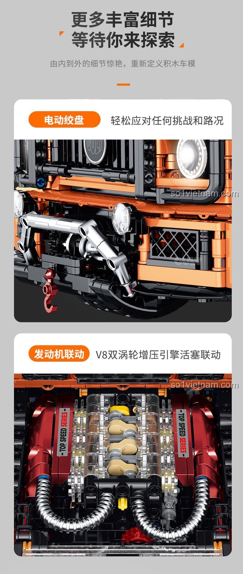 Điều làm nên sự khác biệt của bộ xếp hình GULY 10642 không chỉ nằm ở vẻ ngoài mà còn ở ‘trái tim’ cơ khí bên trong. Đây là một bộ đồ chơi chuẩn Technic, cho phép người chơi khám phá các nguyên lý hoạt động của một chiếc ô tô thực thụ. Khi mở nắp capo, bạn sẽ thấy khối động cơ V8 tăng áp kép được mô phỏng cực kỳ chi tiết. Điều kỳ diệu là khi xe di chuyển, các piston bên trong động cơ cũng sẽ chuyển động lên xuống nhịp nhàng. Vô lăng trong cabin được kết nối trực tiếp với hệ thống lái, cho phép bạn xoay vô lăng để điều khiển hướng của hai bánh trước. Đặc biệt, hệ thống treo độc lập ở cả 4 bánh giúp xe vận hành êm ái trên các địa hình gồ ghề. Nhưng đó chưa phải là tất cả! Bộ sản phẩm này được thiết kế để có thể nâng cấp với bộ động cơ và điều khiển từ xa (bán riêng). Khi được nâng cấp, chiếc G63 sẽ biến thành một cỗ máy RC thực thụ, có thể tiến, lùi, rẽ trái, phải, và đặc biệt là tính năng nâng hạ khung gầm bằng điện cực ngầu!