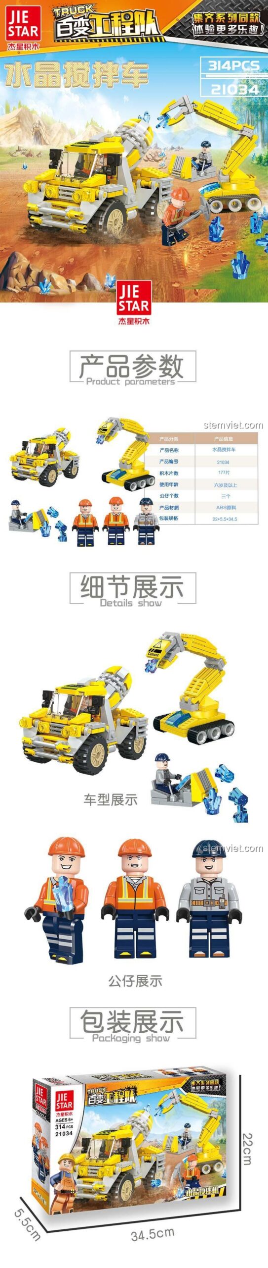 Bộ lắp ghép Xe Trộn Bê Tông và Máy Xúc JIESTAR 21034 gây ấn tượng mạnh mẽ với thiết kế tỉ mỉ và màu sắc chủ đạo là vàng và xám, tái hiện chân thực hình ảnh những chiếc xe công trình mạnh mẽ. Mỗi chi tiết, từ cabin lái, bánh xe hầm hố của xe trộn bê tông đến cần cẩu linh hoạt và gầu xúc của máy xúc, đều được gia công tinh xảo, đảm bảo độ chính xác cao khi lắp ráp. Đặc biệt, bộ đồ chơi còn đi kèm với những khối pha lê trong suốt độc đáo, mô phỏng các loại khoáng sản mà máy xúc có thể khai thác, tăng thêm tính chân thực và thú vị cho trải nghiệm chơi. Ba minifigures kỹ sư công trình với trang phục đặc trưng cũng được trang bị đầy đủ, giúp bé dễ dàng nhập vai và tạo nên những câu chuyện công trường sống động. Dù không có tỉ lệ mô hình cụ thể, nhưng kích thước tổng thể của các mô hình sau khi hoàn thiện rất cân đối, phù hợp để bé cầm nắm và tương tác.