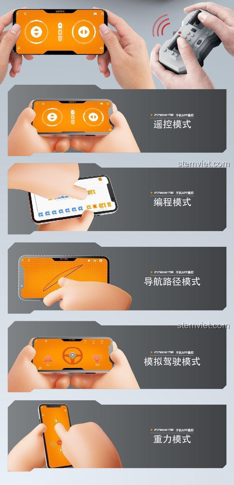 Điểm nhấn nổi bật nhất của IM.Master 8053 chính là khả năng điều khiển kép và lập trình thông minh. Bé có thể điều khiển robot bằng tay cầm RC 2.4Ghz đi kèm hoặc thông qua ứng dụng di động chuyên dụng. Ứng dụng mở ra một thế giới điều khiển hoàn toàn mới với 5 chế độ hấp dẫn: