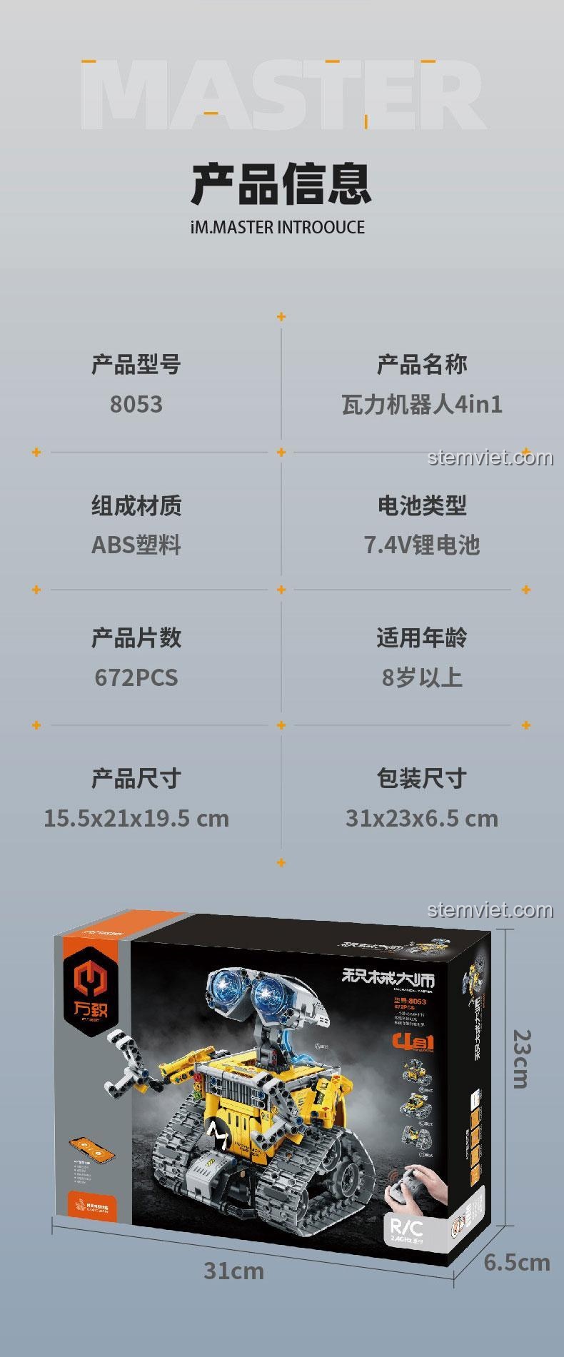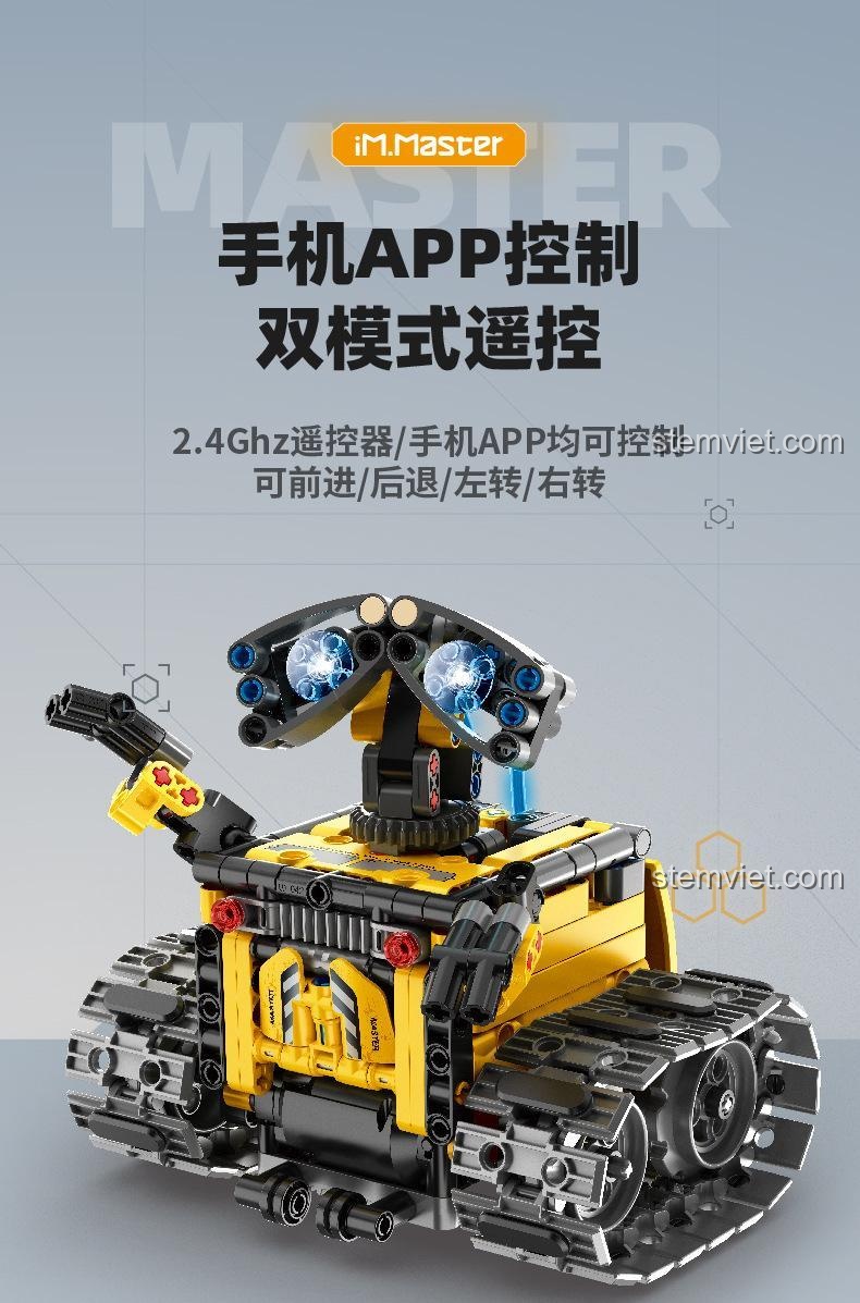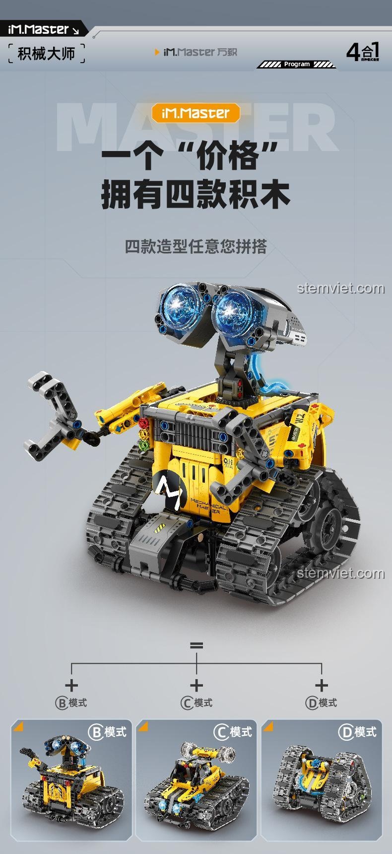 Mẹ có con trai 8 tuổi thân mến, có phải mẹ đang tìm kiếm một món đồ chơi không chỉ để giải trí mà còn giúp con phát triển trí tuệ, khơi dậy niềm đam mê khoa học? Hãy quên đi những mô hình tĩnh nhàm chán. Giới thiệu bộ lắp ráp Robot WALL-E IM.Master 8053 – một sản phẩm đột phá, nơi con không chỉ lắp ráp mà còn có thể thổi hồn vào nhân vật, điều khiển và lập trình cho chú robot của riêng mình. Đây không chỉ là một món đồ chơi, mà là một cánh cửa mở ra thế giới công nghệ, kỹ thuật và lập trình đầy hấp dẫn, được lấy cảm hứng từ nhân vật robot dọn rác đáng yêu và đầy ý nghĩa trong bộ phim hoạt hình nổi tiếng ‘WALL-E’ của Pixar. Cùng con tái hiện lại câu chuyện về chú robot cô đơn trên Trái Đất, thực hiện nhiệm vụ làm sạch hành tinh, và bắt đầu cuộc phiêu lưu của riêng mình.