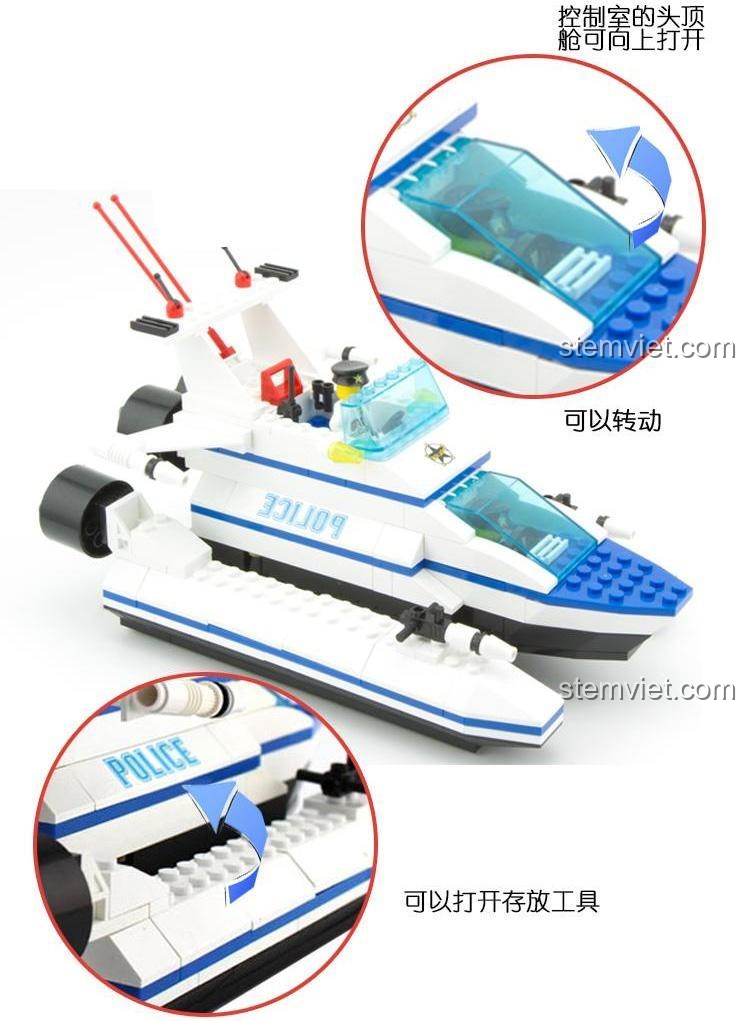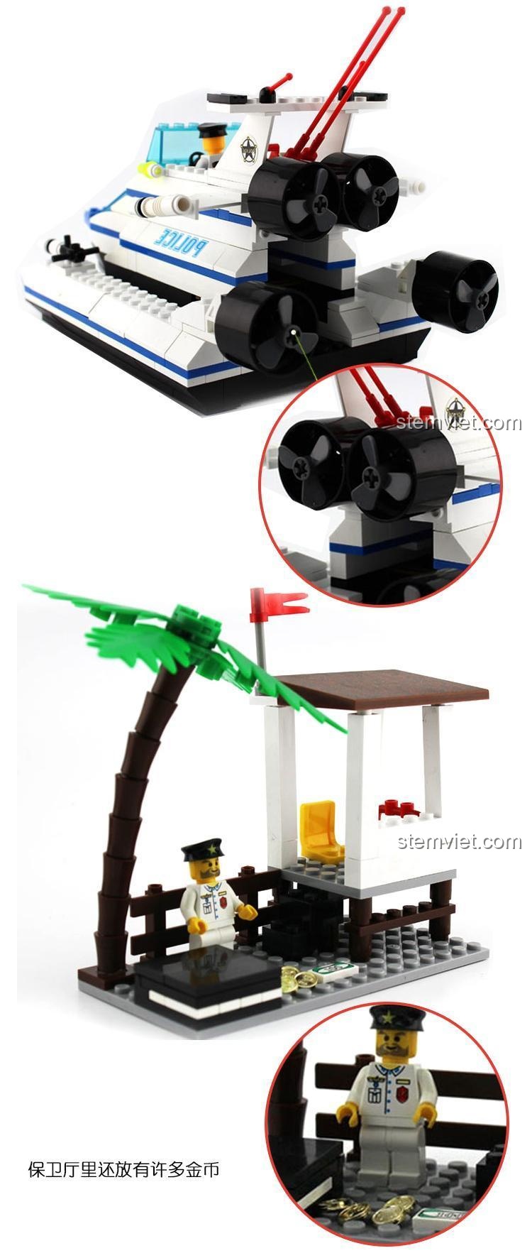 Điểm sáng giá nhất của bộ sản phẩm chính là chiếc tàu cảnh sát đệm khí (hovercraft) được thiết kế vô cùng ấn tượng. Với tông màu trắng và xanh dương đặc trưng của lực lượng chấp pháp, con tàu toát lên vẻ uy nghiêm và hiện đại. Kích thước sau khi lắp ráp lên tới 23cm chiều dài và 10cm chiều rộng, tạo nên một mô hình hoành tráng, cầm chắc tay. Các chi tiết như buồng lái, phòng chỉ huy, ăng-ten, động cơ đẩy đều được tái hiện tỉ mỉ. Đối lập với đó là chiếc thuyền của bọn tội phạm, mang màu đen và đỏ đầy bí ẩn, được trang trí bằng hình cá mập dữ tợn, thể hiện rõ bản chất nguy hiểm. Ngoài ra, bộ sản phẩm còn có một mô tô nước nhỏ gọn, linh hoạt cho các nhiệm vụ áp sát và một trạm gác bờ biển với cây dừa xanh mát, nơi các chú cảnh sát có thể quan sát và lên kế hoạch tác chiến.