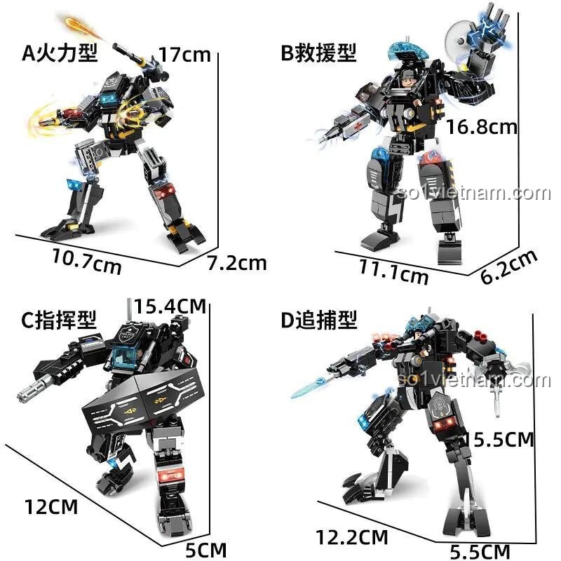 - Biệt đội 4 robot chuyên biệt: Mỗi robot trong bộ tứ đều có thiết kế và vai trò riêng, thể hiện qua màu sắc và vũ khí độc đáo. Tông màu chủ đạo là đen và xám mạnh mẽ của lực lượng SWAT, điểm xuyết các chi tiết màu vàng, xanh dương tạo điểm nhấn công nghệ cao.