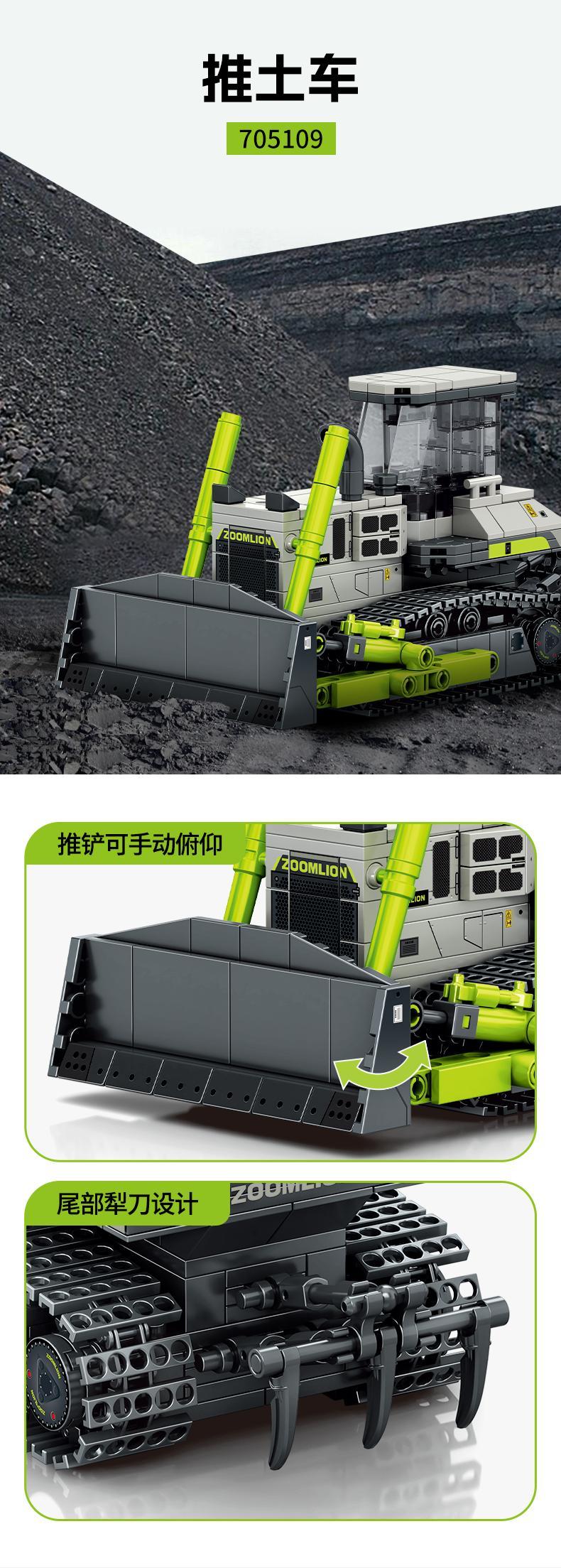 Ngay từ cái nhìn đầu tiên, đồ chơi mô hình Xe ủi đất hạng nặng SEMBO 705109 đã gây ấn tượng mạnh mẽ bởi thiết kế chân thực và tỉ mỉ đến từng chi tiết. Khoác lên mình tông màu xám công nghiệp mạnh mẽ, kết hợp với màu đen của hệ thống bánh xích và điểm nhấn xanh lá neon nổi bật, mô hình tái hiện một cách sống động hình ảnh của một chiếc xe ủi Zoomlion thực thụ. Với kích thước sau khi hoàn thiện là 18.7 x 11.2 x 10.2 cm, mô hình có tỷ lệ cân đối, vừa vặn để bé cầm nắm và vui chơi. Buồng lái được thiết kế chi tiết với các ô cửa kính trong suốt, cho phép bé nhìn thấy không gian điều khiển bên trong. Điểm đặc biệt nhất chính là hệ thống lưỡi ủi khổng lồ phía trước và dàn xới đa chấu phía sau, tất cả đều được chế tác tinh xảo, mô phỏng chính xác các bộ phận cơ khí phức tạp. Hệ thống bánh xích cũng được lắp ráp từ nhiều mắt xích nhỏ, có khả năng chuyển động mượt mà trên nhiều địa hình, mang lại cảm giác vận hành như thật cho bé.