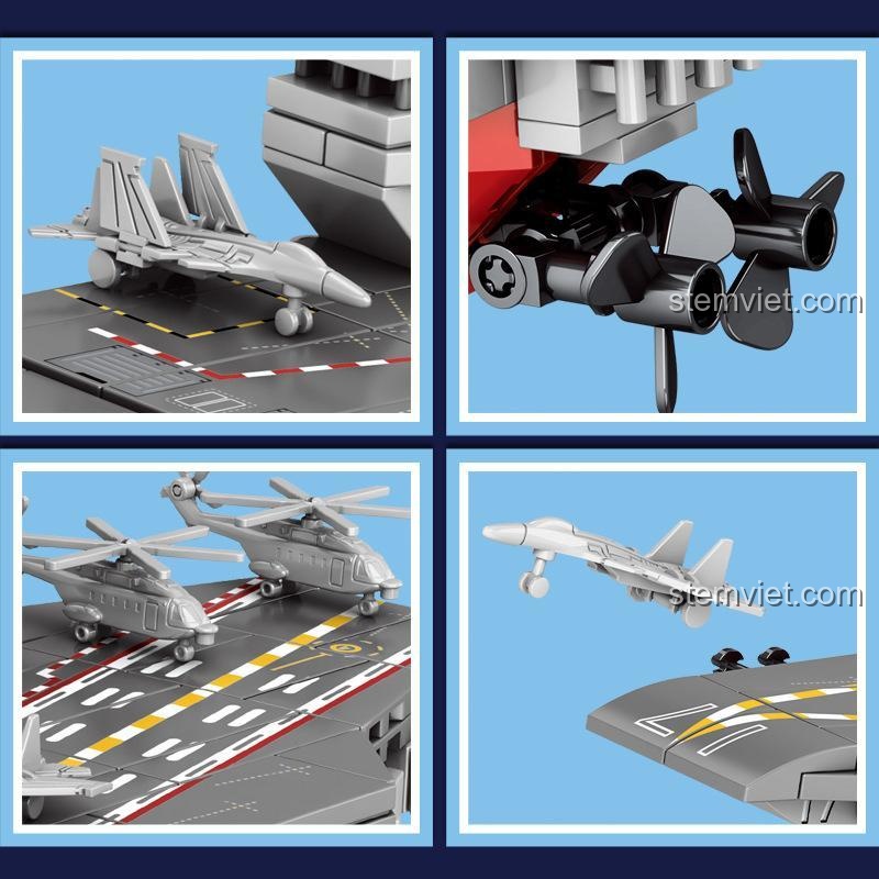 Dạ có ạ. Ngoài các mảnh ghép để tạo thành tàu sân bay, bộ sản phẩm còn bao gồm các mô hình máy bay chiến đấu, trực thăng mini siêu ngầu và 3 nhân vật minifigure thủy thủ đoàn để bé có thể dàn dựng những kịch bản hải chiến sống động nhất.