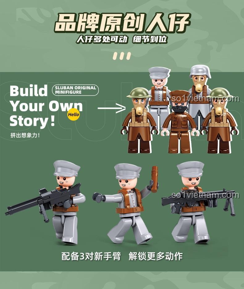 - Minifigures đa khớp nối: Điểm đặc biệt của minifigures Sluban là chúng có rất nhiều khớp nối linh hoạt ở cổ, vai, khuỷu tay, hông và chân. Điều này cho phép bé tạo ra vô số tư thế khác nhau: đang chạy, đang ngắm bắn, đang chỉ huy… làm cho các kịch bản chơi của bé thêm phần sống động.